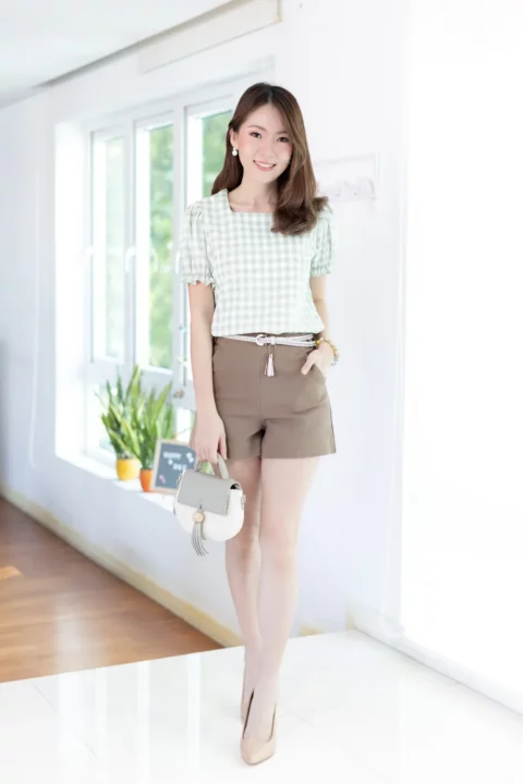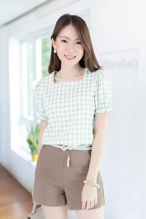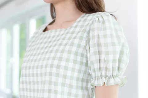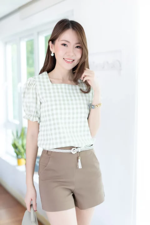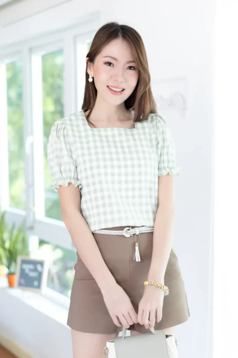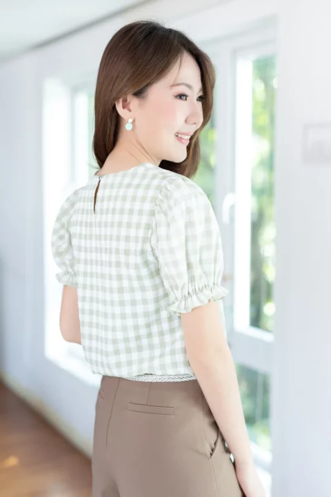 เสื้อลายตารางเติมกลิ่นความ Retro แบบน่ารัก คอเหลี่ยมแบบไม่กว้างมาก แขนตุ๊กตาจั๊มปลายยางยืด ด้านหลังผ่าหยดน้ำติดกระดุมคอ เนื้อผ้าโพลีเอสเตอร์ อัดย่นๆ ผ้ายืดเล็กน้อย ใส่แล้วโลกสดใสเลย