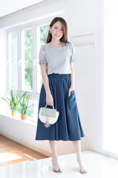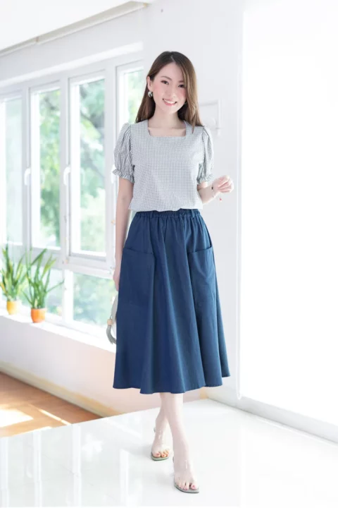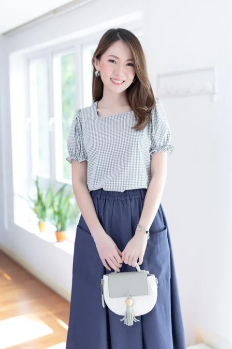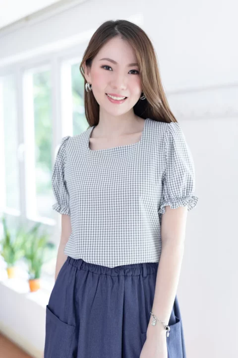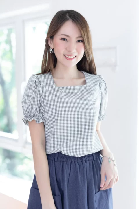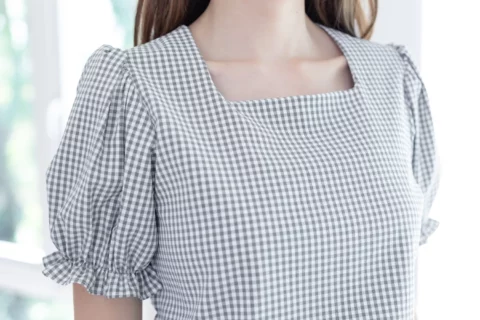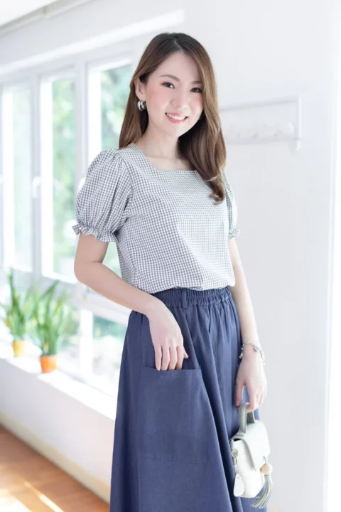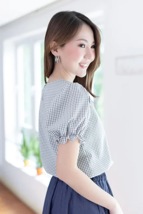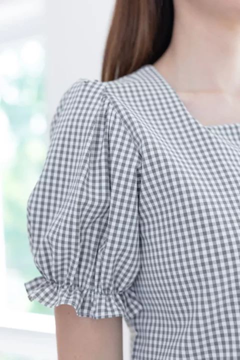 เสื้อลายตารางเติมกลิ่นความ Retro แบบน่ารัก คอเหลี่ยมแบบไม่กว้างมาก แขนตุ๊กตาจั๊มปลายยางยืด ด้านหลังผ่าหยดน้ำติดกระดุมคอ เนื้อผ้าโพลีเอสเตอร์ อัดย่นๆ ผ้ายืดเล็กน้อย ใส่แล้วโลกสดใสเลย