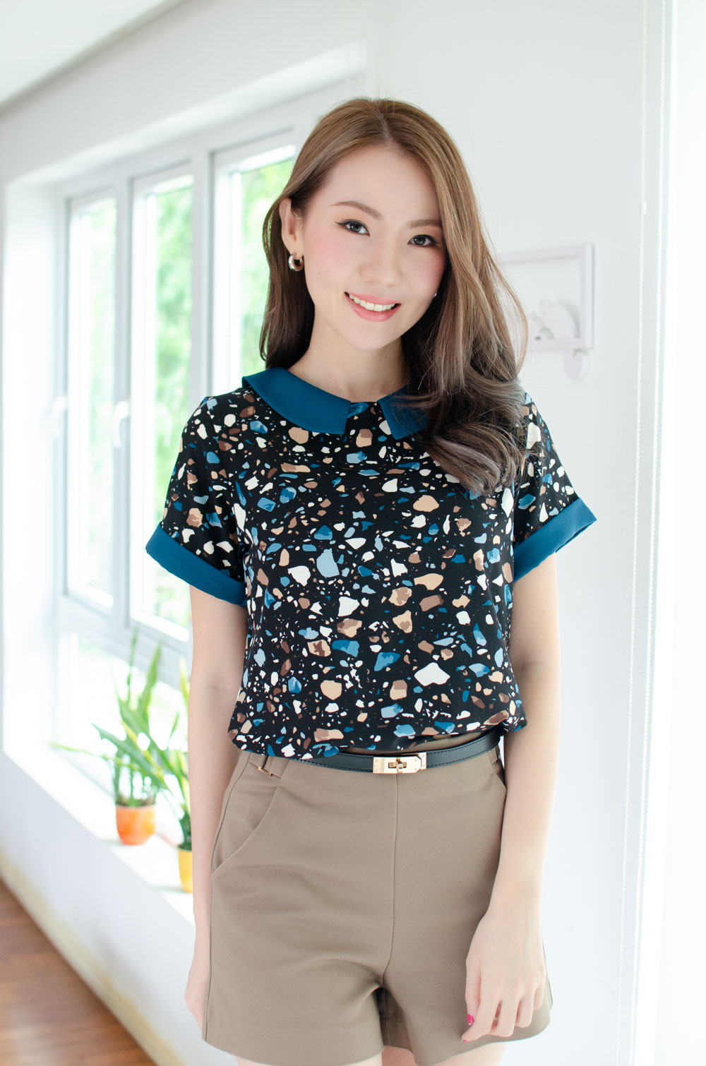 เสื้อเนื้อดี ด้านหน้าแต่งปกบัวห่าง ด้านหลังผ่าหยดน้ำติดกระดุมสวมใส่ง่าย แขนสั้นแต่งขอบด้วยผ้าพื้นแล้วพับเย็บฟิกซ์ ตัวเสื้อเป็นผ้าพิมพ์ลายกราฟิก ลุคนี้สวยเก๋ค่ะ