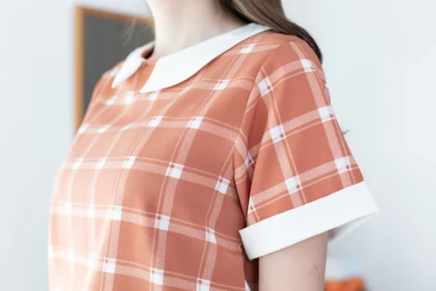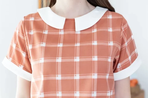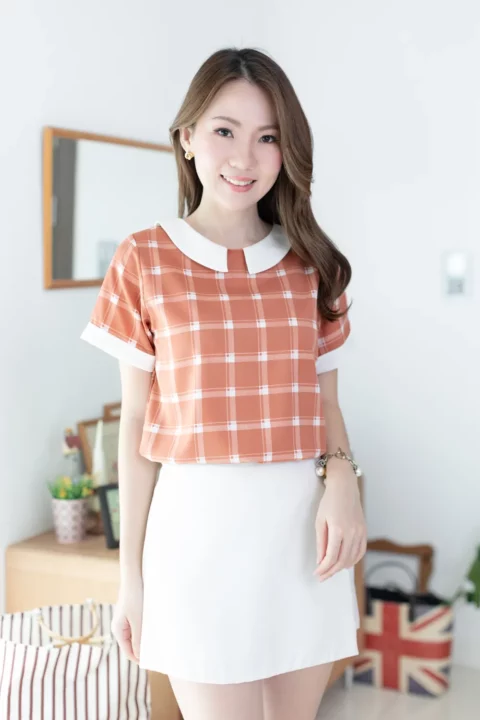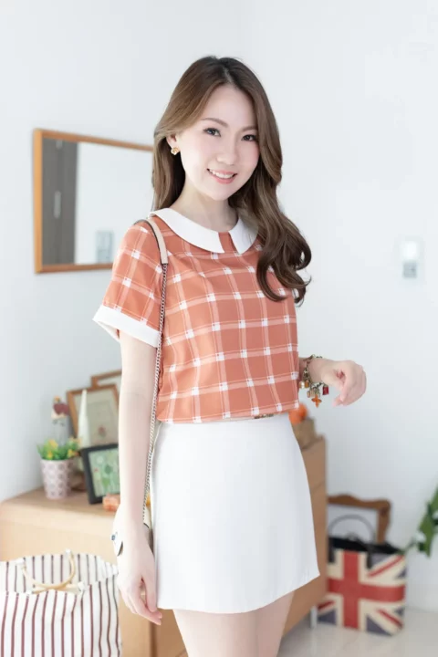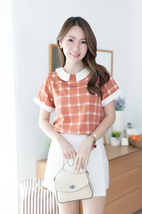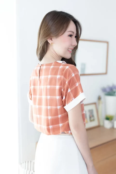 เสื้อเนื้อดี ด้านหน้าแต่งปกบัวห่าง ด้านหลังผ่าหยดน้ำติดกระดุมสวมใส่ง่าย แขนสั้นแต่งขอบด้วยผ้าพื้นแล้วพับเย็บฟิกซ์ อิตาลีเนื้อเนียนลายตารางดูเก๋ ลุคนี้สวยแบบเรียบร้อย