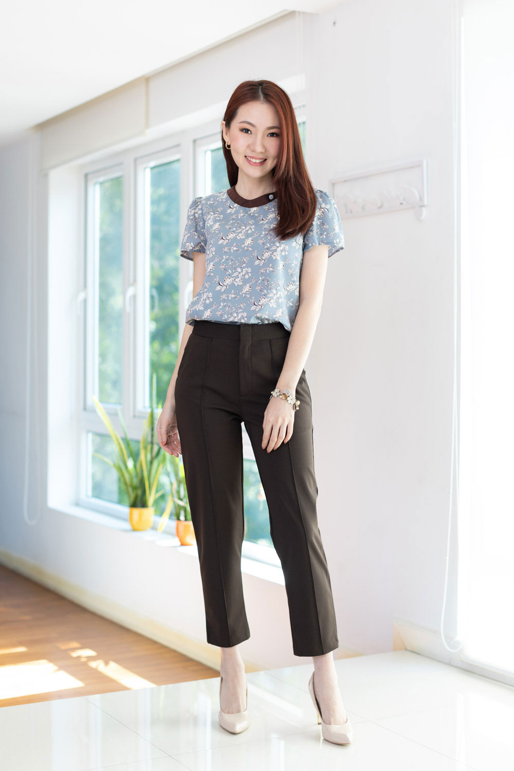 เสื้อคอกลม ขอบคอสีพื้นซ้อนกัน แต่งกระดุมปั๊ม 1 เม็ด ตัวเสื้อใช้ผ้าพิมพ์ลายดอกไม้ เนื้อไหมอิตาลีเนียนๆ รีดง่ายดูแลง่าย แขนสั้นจับจีบตุ๊กตาหัวไหล่ให้ดูน่ารัก ทรงเก๋ไก๋ใส่สบายๆ