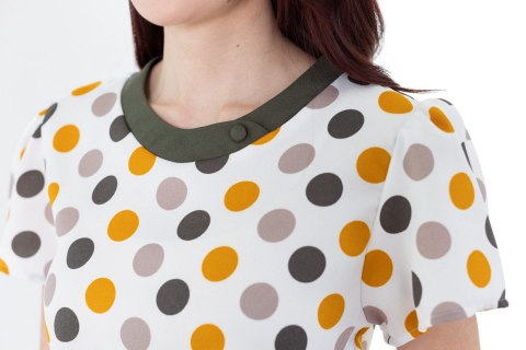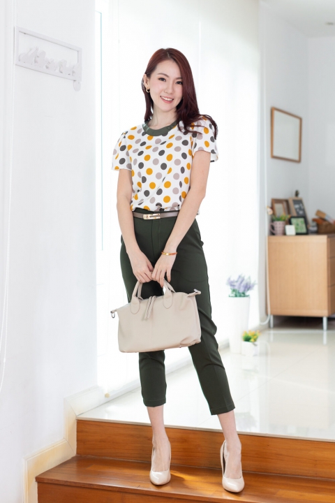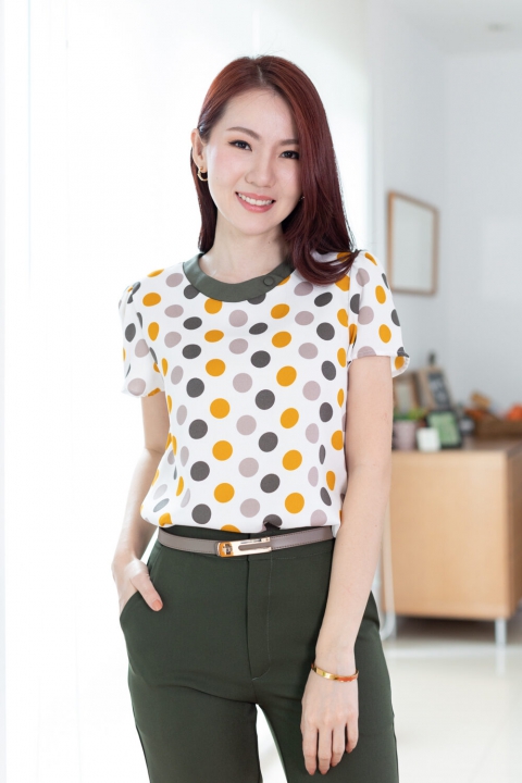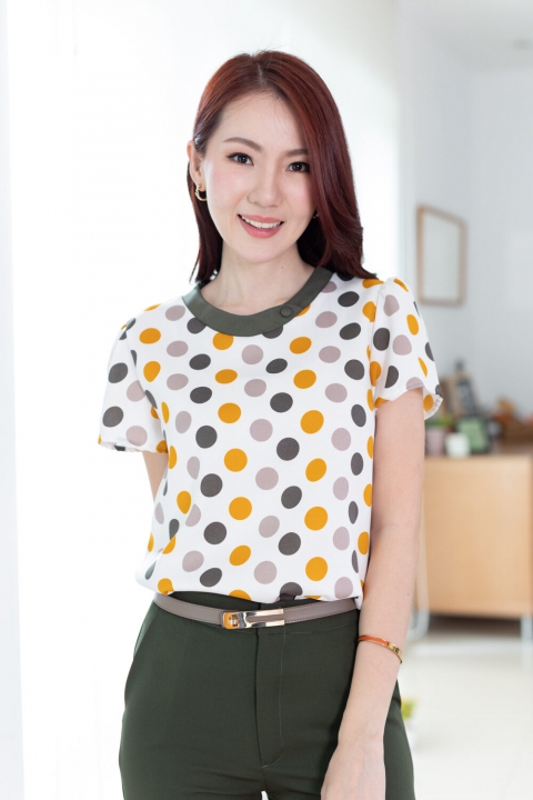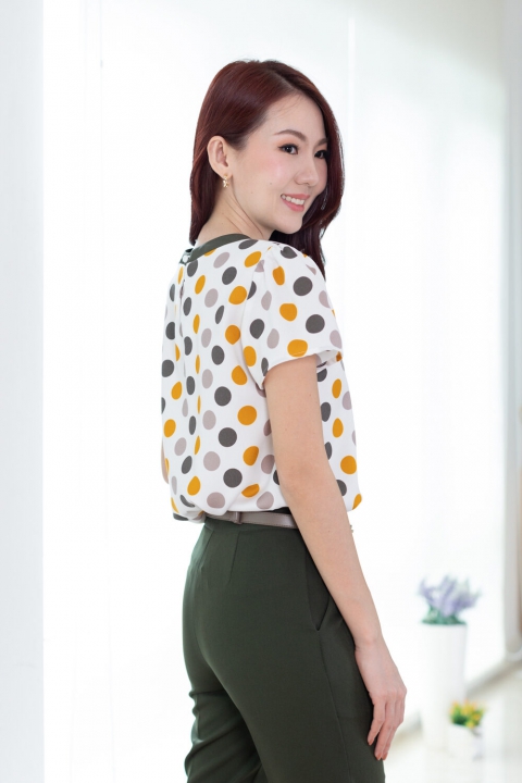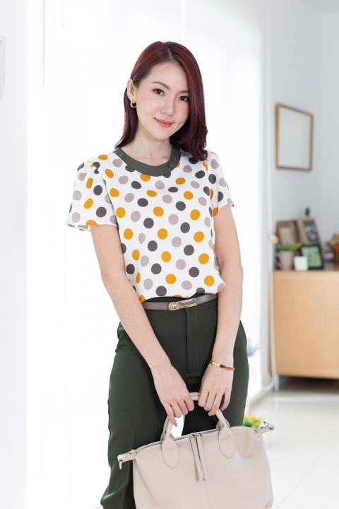 เสื้อคอกลม ขอบคอสีพื้นซ้อนกัน แต่งกระดุมปั๊ม 1 เม็ด ตัวเสื้อใช้ผ้าพิมพ์ลายจุด เนื้อโฟร์เวย์ รีดง่ายดูแลง่าย แขนสั้นจับจีบตุ๊กตาหัวไหล่ให้ดูน่ารัก ทรงเก๋ไก๋ใส่สบายๆ