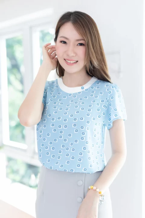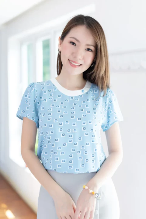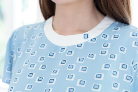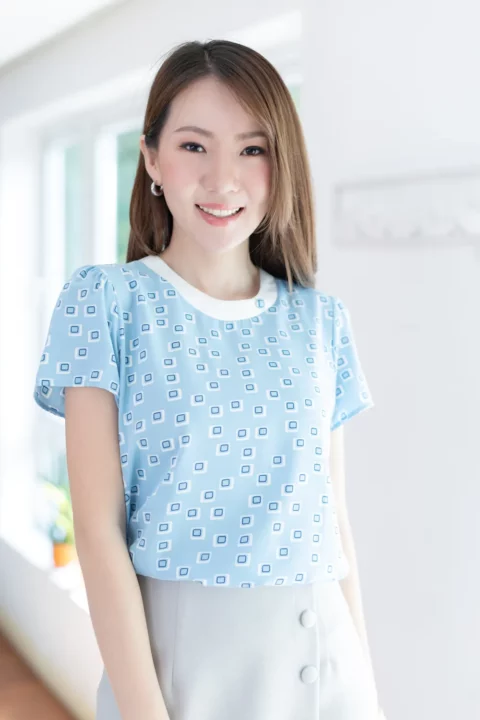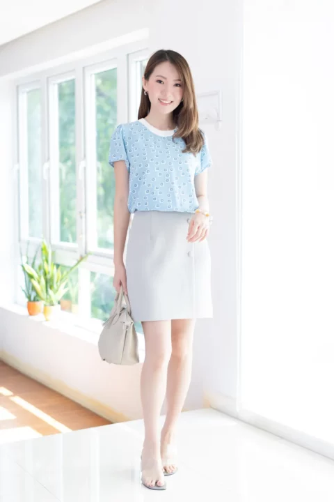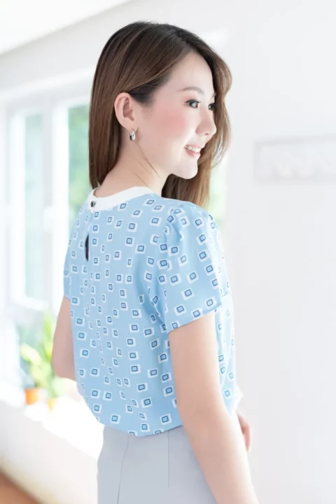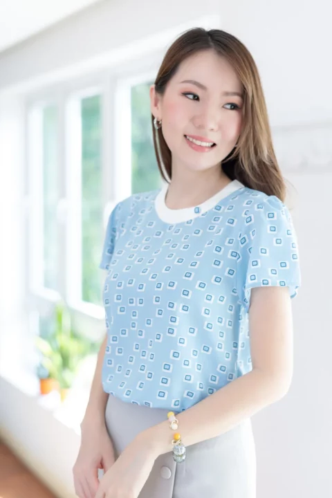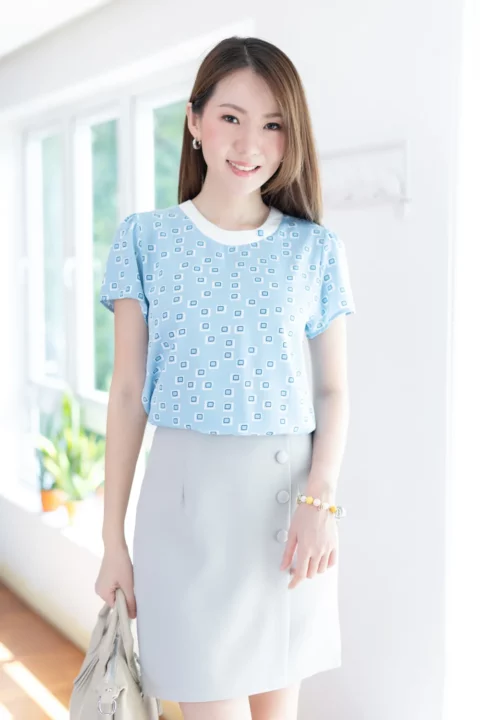 เสื้อคอกลม ขอบคอสีพื้นซ้อนกัน แต่งกระดุมปั๊ม 1 เม็ด ตัวเสื้อใช้ผ้าพิมพ์ลายกราฟิก เนื้อไหมอิตาลีเนียนๆ รีดง่ายดูแลง่าย แขนสั้นจับจีบตุ๊กตาหัวไหล่ให้ดูน่ารัก ทรงเก๋ไก๋ใส่สบายๆ