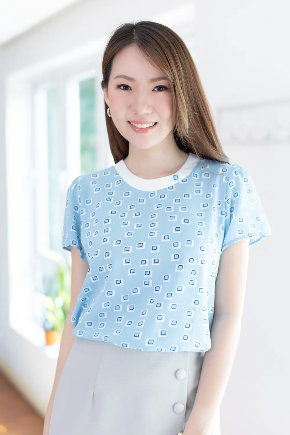เสื้อคอกลม ขอบคอสีพื้นซ้อนกัน แต่งกระดุมปั๊ม 1 เม็ด ตัวเสื้อใช้ผ้าพิมพ์ลายกราฟิก เนื้อไหมอิตาลีเนียนๆ รีดง่ายดูแลง่าย แขนสั้นจับจีบตุ๊กตาหัวไหล่ให้ดูน่ารัก ทรงเก๋ไก๋ใส่สบายๆ