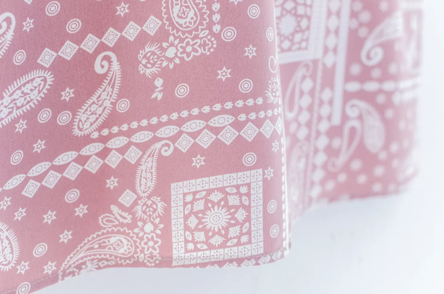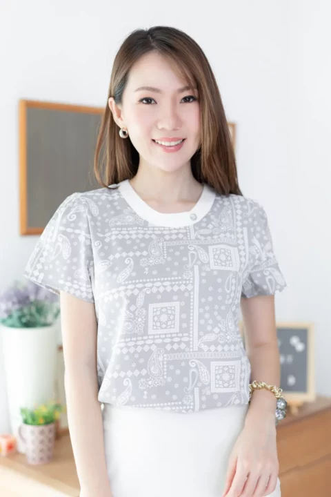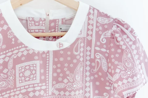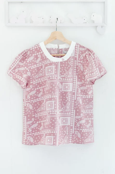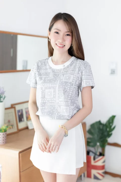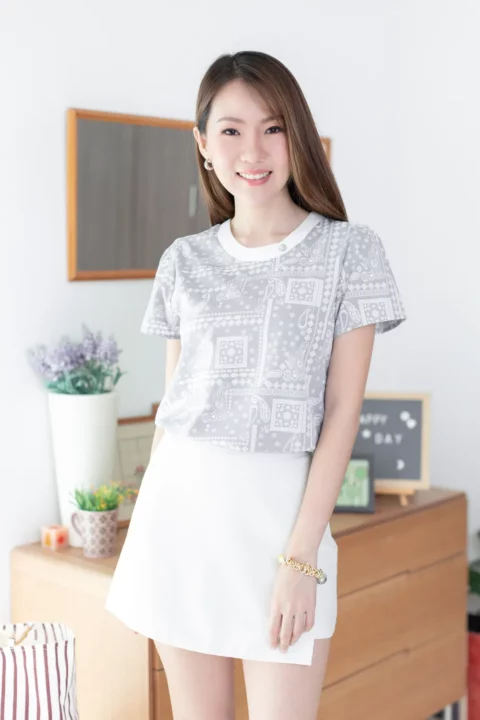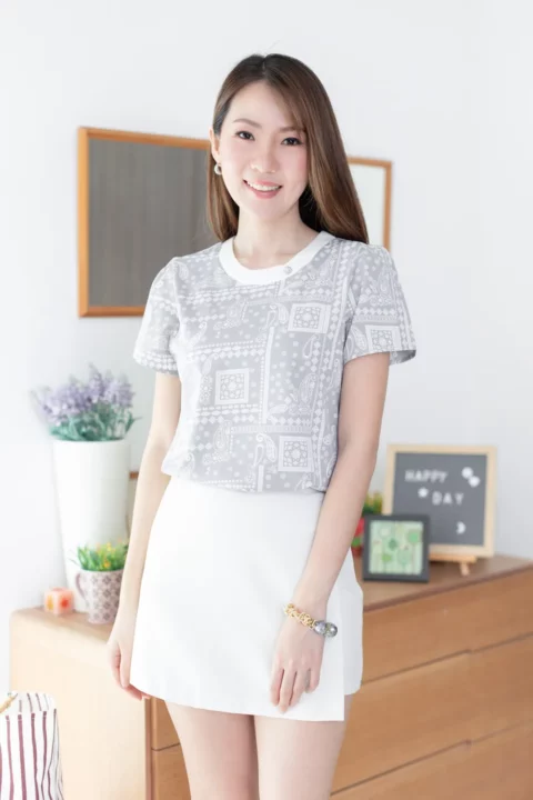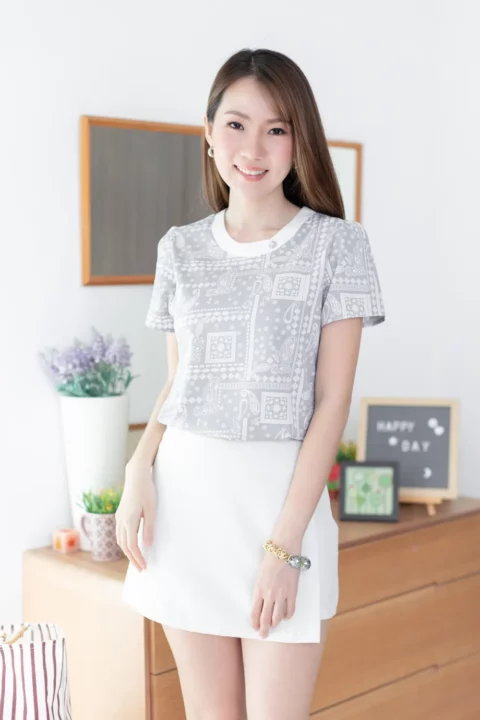 เสื้อคอกลม ขอบคอสีพื้นซ้อนกัน แต่งกระดุมปั๊ม 1 เม็ด ตัวเสื้อใช้ผ้าพิมพ์ลายกราฟิก เนื้อไหมอิตาลีเนียนๆ รีดง่ายดูแลง่าย แขนสั้นจับจีบตุ๊กตาหัวไหล่ให้ดูน่ารัก ทรงเก๋ไก๋ใส่สบายๆ