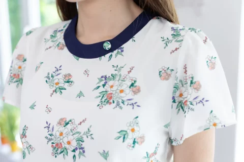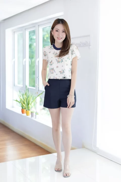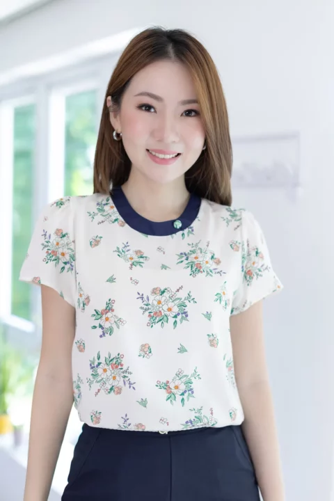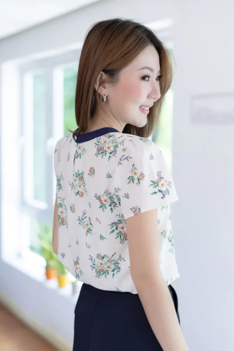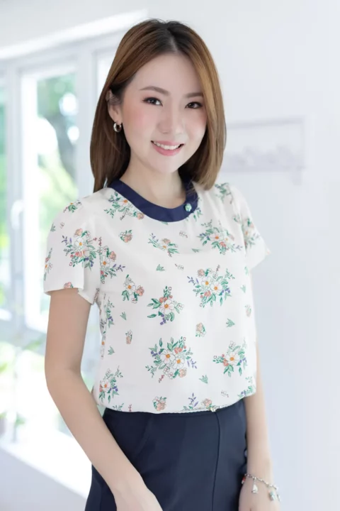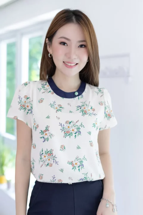 เสื้อคอกลม ขอบคอสีพื้นซ้อนกัน แต่งกระดุมปั๊ม 1 เม็ด ตัวเสื้อใช้ผ้าพิมพ์ลายดอกไม้ เนื้อผ้าไหมอิตาลีเนียนๆ รีดง่ายดูแลง่าย แขนสั้นจับจีบตุ๊กตาหัวไหล่ให้ดูน่ารัก ทรงเก๋ไก๋ใส่สบายๆ