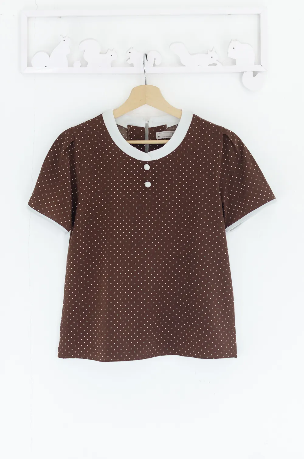 เสื้อคอกลม ผ้าลายจุดแต่งขอบคอสีพื้น วางขอบซ้อนกันเก๋ๆ แต่งกระดุมปั๊มคู่ สวยเรียบง่ายแบบมีเอกลักษณ์ แขนสั้นกุ๊นขอบแขน ด้านหลังผ่าหยดน้ำสวมใส่ง่าย ผ้าไหมอิตาลีเนียนๆ ดูแลง่ายรีดง่ายแห้งไวเหมือนเดิม ทรงคอดใต้อกแบบเบาๆพอดีตัวขึ้นนิดๆ
