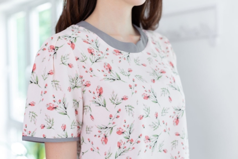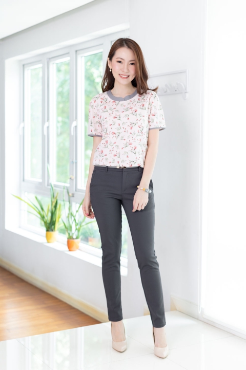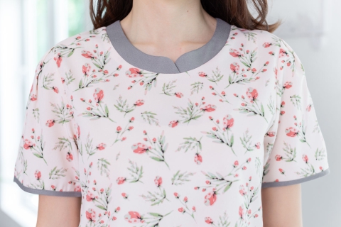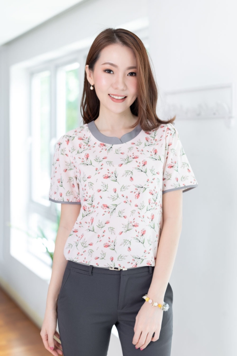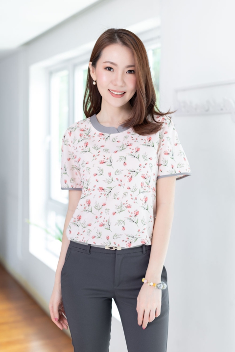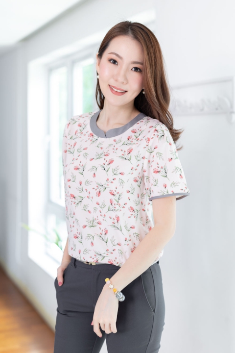 เสื้อคอกลม ผ้าลายดอกไม้แต่งขอบคอสีพื้น วางขอบซ้อนกันเก๋ๆ สวยเรียบง่ายแบบมีเอกลักษณ์ แขนสั้นกุ๊นขอบแขน ด้านหลังผ่าหยดน้ำสวมใส่ง่าย ผ้าไหมอิตาลีเนียนๆ ดูแลง่ายรีดง่ายแห้งไวเหมือนเดิมค่ะ