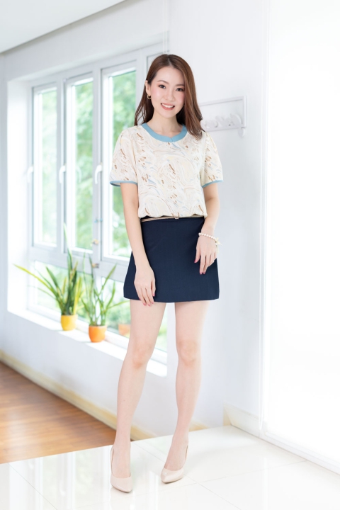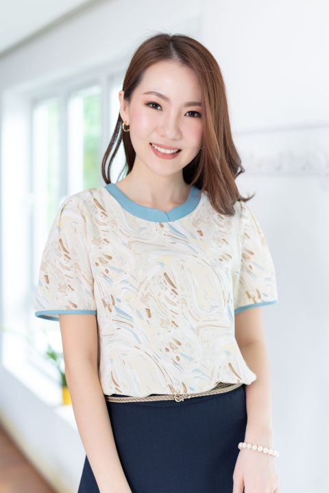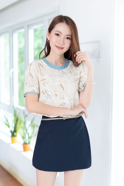 เสื้อคอกลม ผ้าลายกราฟิกนวลๆแต่งขอบคอสีพื้น วางขอบซ้อนกันเก๋ๆ สวยเรียบง่ายแบบมีเอกลักษณ์ แขนสั้นกุ๊นขอบแขน ด้านหลังผ่าหยดน้ำสวมใส่ง่าย ผ้าไหมอิตาลีเนียนๆ ดูแลง่ายรีดง่ายแห้งไวเหมือนเดิมค่ะ