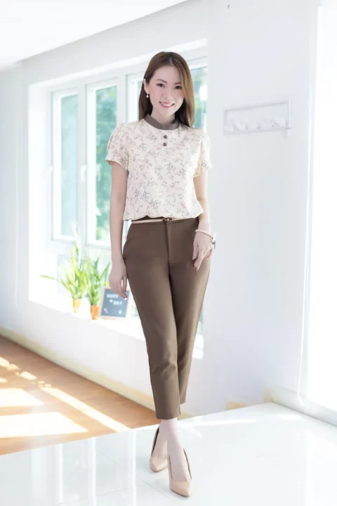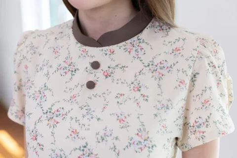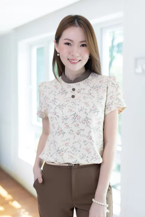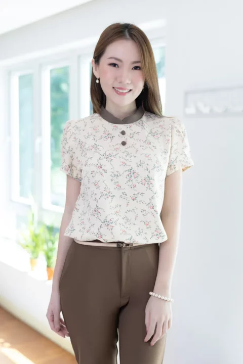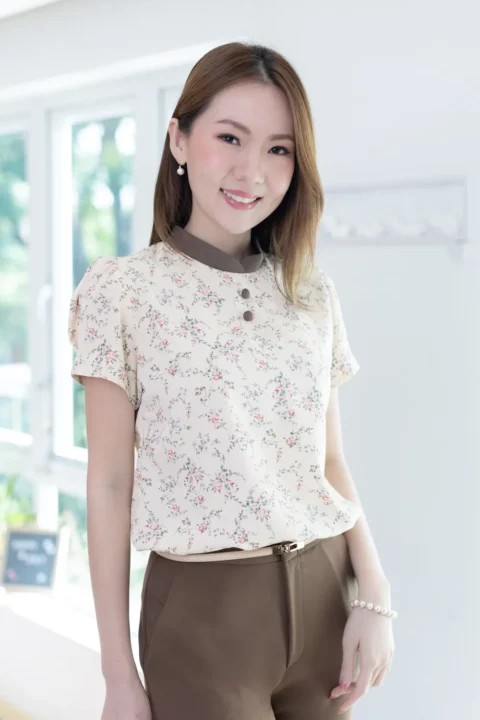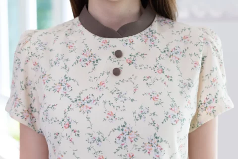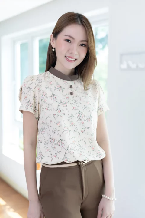 เสื้อคอกลมปิดต่อแขนสั้น จับจีบที่ปลายแขนดูพองนิดๆ แต่งกระดุมหลอกด้านหน้า ขอบคอสีพื้นวางซ้อนกัน ตัดกับผ้าพิมพ์ลายเถาดอกไม้ คอผ่าหยดน้ำหลังติดกระดุม ทรงน่ารักมากๆ กระตุกใจสุดๆ