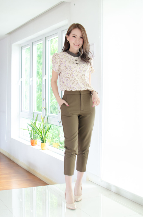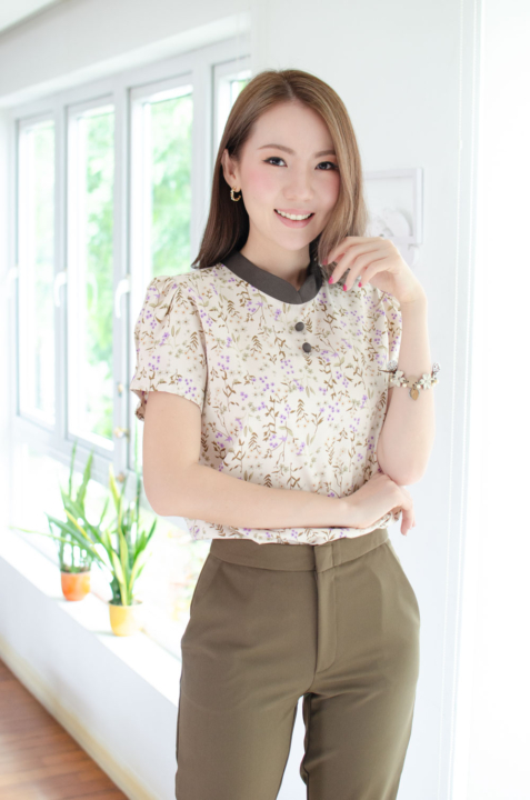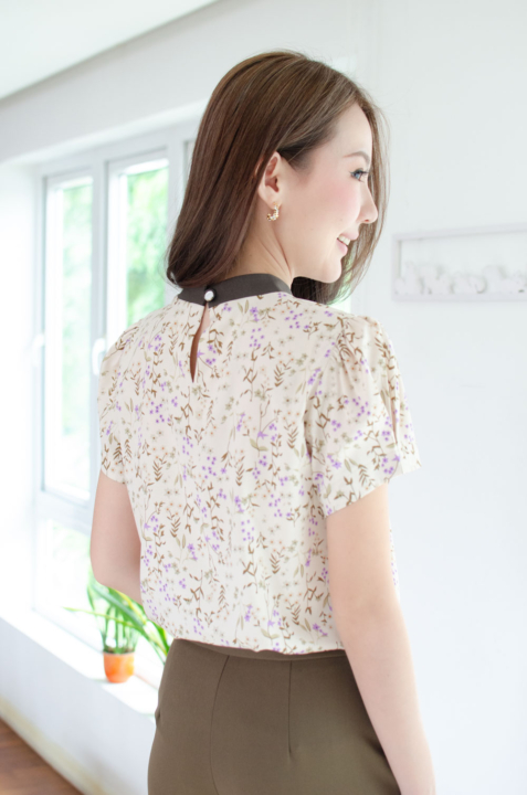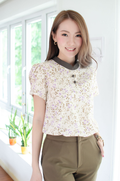 เสื้อคอกลมปิดต่อแขนสั้น จับจีบที่ปลายแขนดูพองนิดๆ ขอบคอสีพื้นวางซ้อนกัน ตัดกับผ้าพิมพ์ลายดอกไม้ ผ่าหยดน้ำหลังติดกระดุม ทรงน่ารักมากๆ กระตุกใจสุดๆ