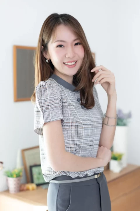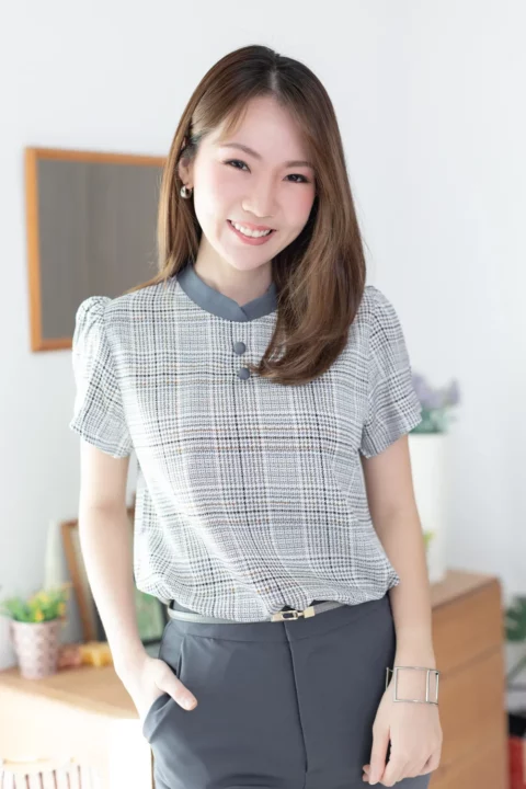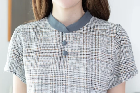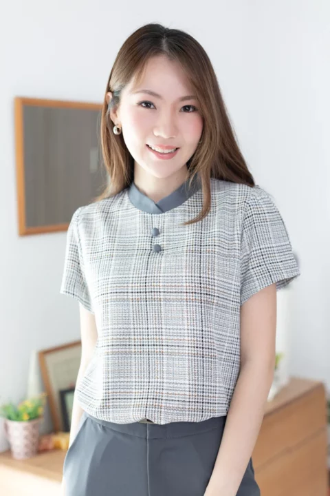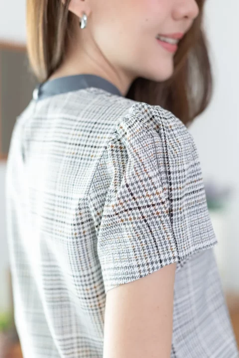 เสื้อคอกลมปิดต่อแขนสั้น จับจีบที่ปลายแขนดูพองนิดๆ แต่งกระดุมหลอกด้านหน้า ขอบคอสีพื้นวางซ้อนกัน ตัดกับผ้าพิมพ์ลายตาราง คอผ่าหยดน้ำหลังติดกระดุม ทรงน่ารักมากๆ กระตุกใจสุดๆ