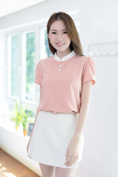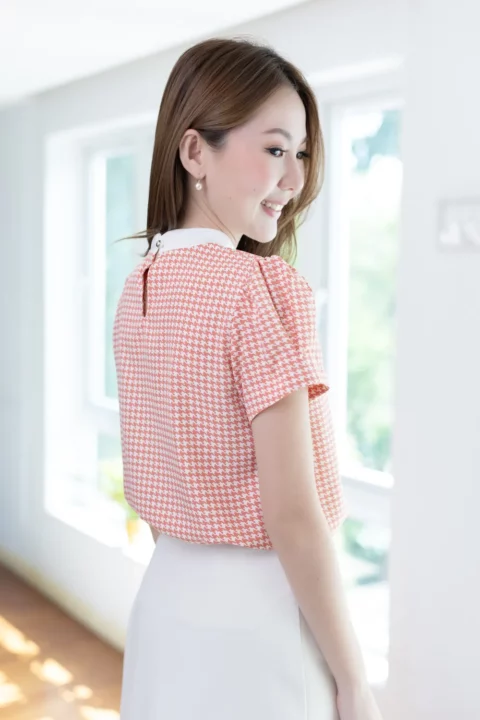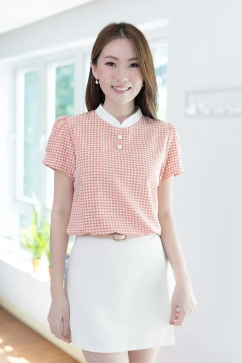 เสื้อคอกลมปิดต่อแขนสั้น จับจีบที่ปลายแขนดูพองนิดๆ แต่งกระดุมหลอกด้านหน้า ขอบคอสีพื้นวางซ้อนกัน ตัดกับผ้าพิมพ์ลายชิโนริ คอผ่าหยดน้ำหลังติดกระดุม ทรงน่ารักมากๆ กระตุกใจสุดๆ