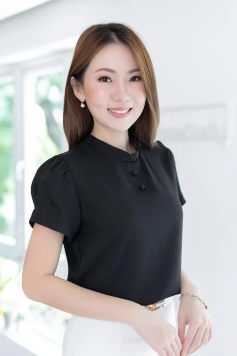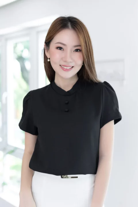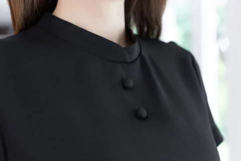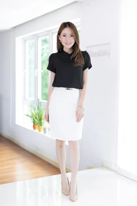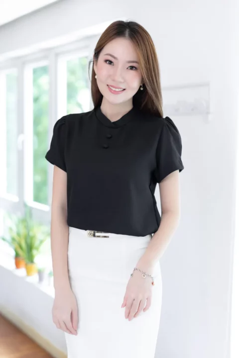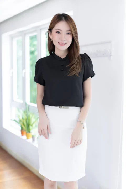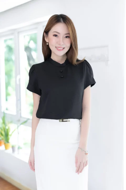 เสื้อคอกลมปิด ต่อแขนสั้น จับจีบที่ปลายแขนดูพองนิดๆ แต่งกระดุมหลอกด้านหน้า ขอบคอวางซ้อนกัน คอผ่าหยดน้ำหลังติดกระดุม ทรงน่ารักกำลังดี มาแบบนิ่งๆในโทนดำล้วนค่ะ
