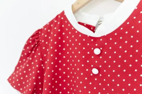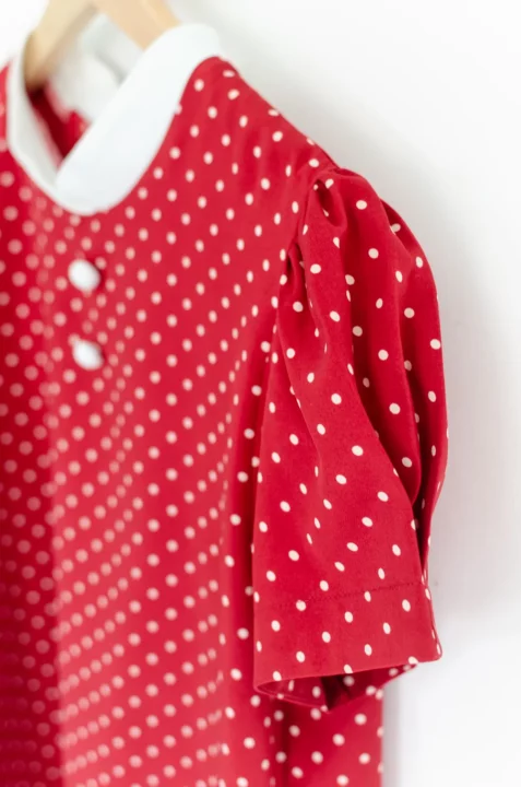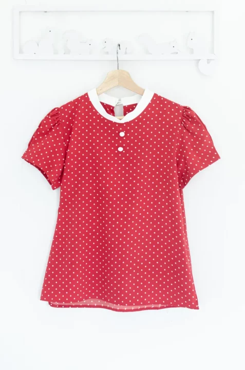 เสื้อคอกลมปิดต่อแขนสั้น จับจีบที่ปลายแขนดูพองนิดๆ ขอบคอสีพื้นวางซ้อนกัน ตัดกับผ้าพิมพ์ลายจุด ผ่าหยดน้ำหลังติดกระดุม ทรงน่ารักมากๆ กระตุกใจสุดๆ