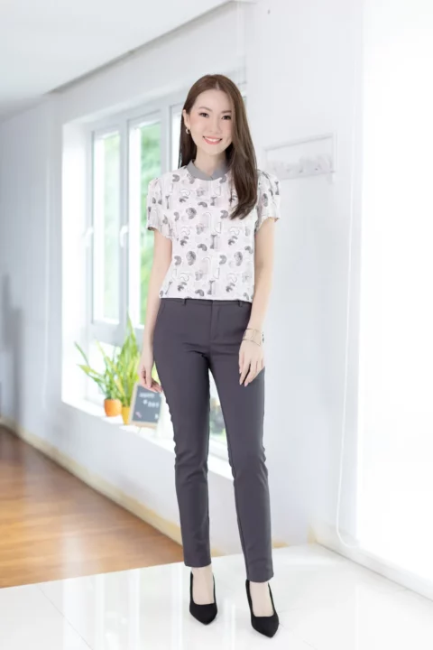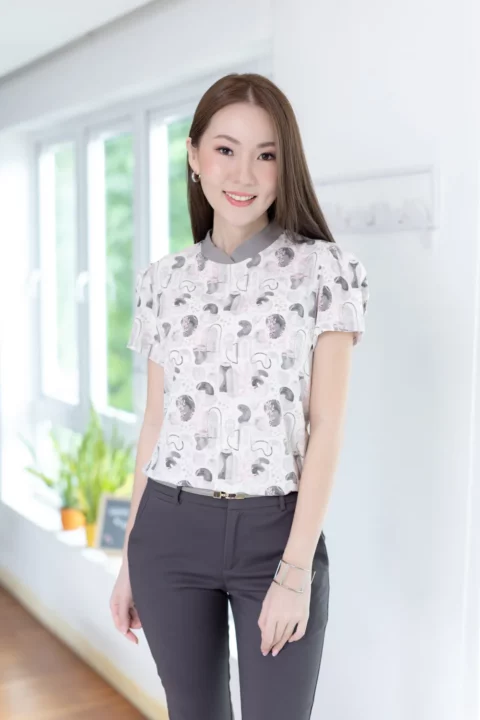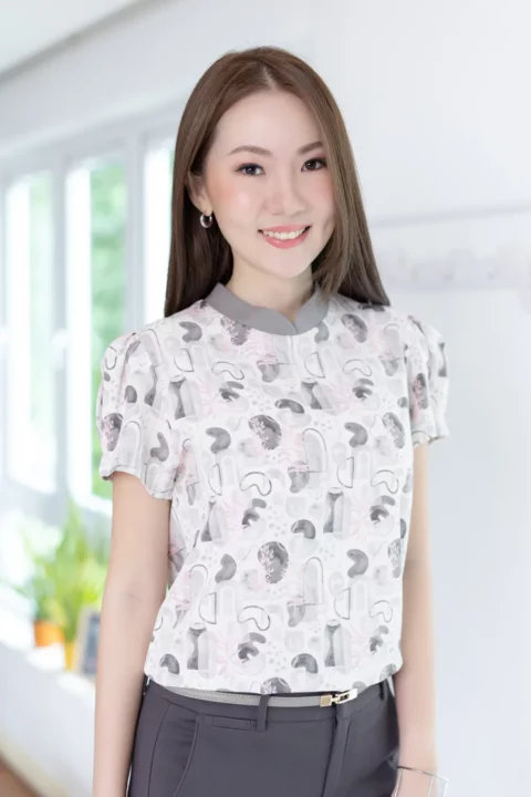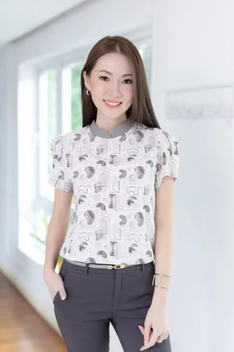 เสื้อคอกลมปิด ต่อแขนสั้นจับจีบที่ปลายแขนดูพองนิดๆ ขอบคอสีพื้นวางซ้อนกัน ตัดกับผ้าพิมพ์ลายตากราฟิก คอผ่าหยดน้ำหลังติดกระดุม ทรงน่ารักมากๆ กระตุกใจสุดๆ
