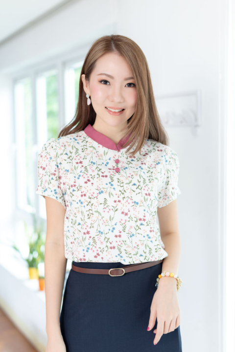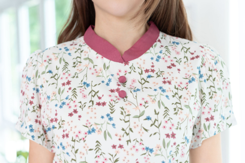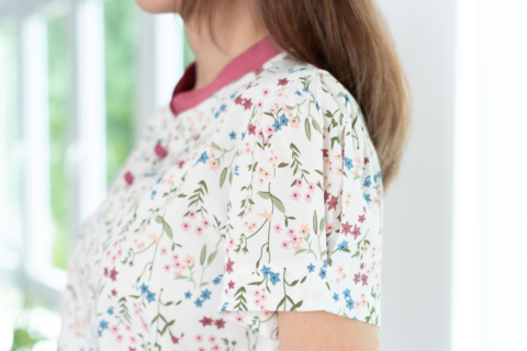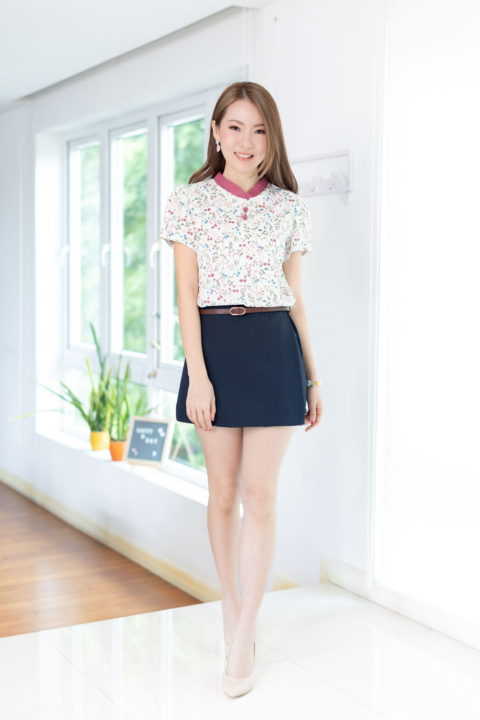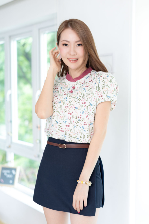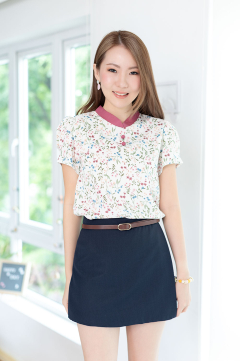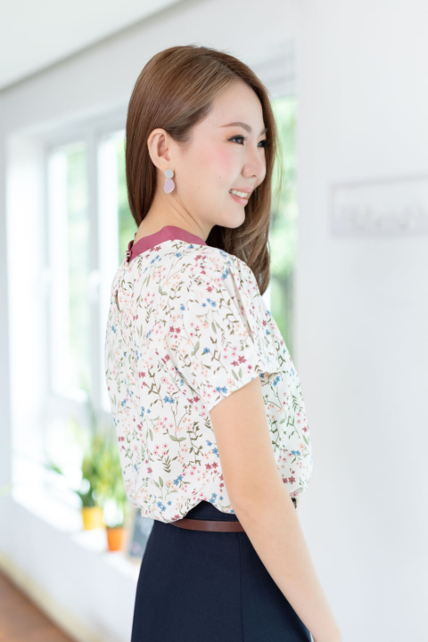 เสื้อคอกลมปิดต่อแขนสั้น จับจีบที่ปลายแขนดูพองนิดๆ ขอบคอสีพื้นวางซ้อนกัน ตัดกับผ้าพิมพ์ลายดอกไม้ ผ่าหยดน้ำหลังติดกระดุม ทรงน่ารักมากๆ กระตุกใจสุดๆ