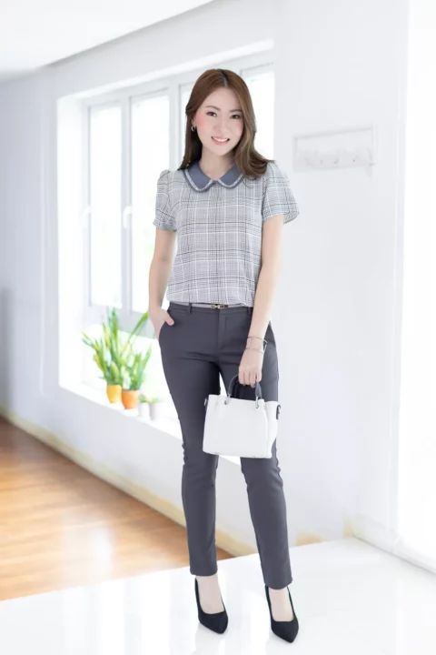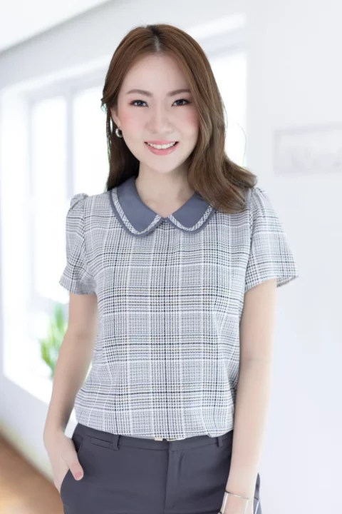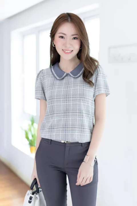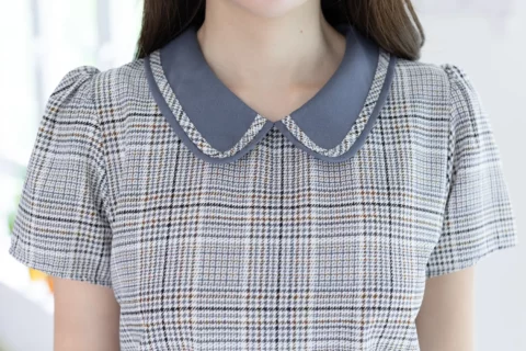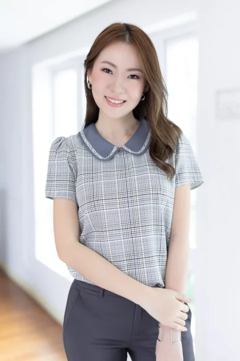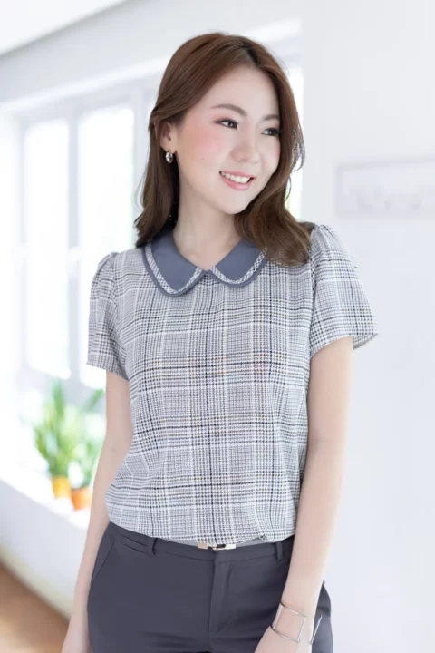 เสื้อปกบัว แต่งขอบปกด้วยกุ๊นยาว น่ารักแบบโดดเด้ง แขนสั้น ทรงใส่ง่ายเหมือนเดิม ผ่าหยดน้ำติดกระดุมคอด้านหลัง สวยด้วย แมทช์ก็ง่าย ใส่ได้ยาวๆ
