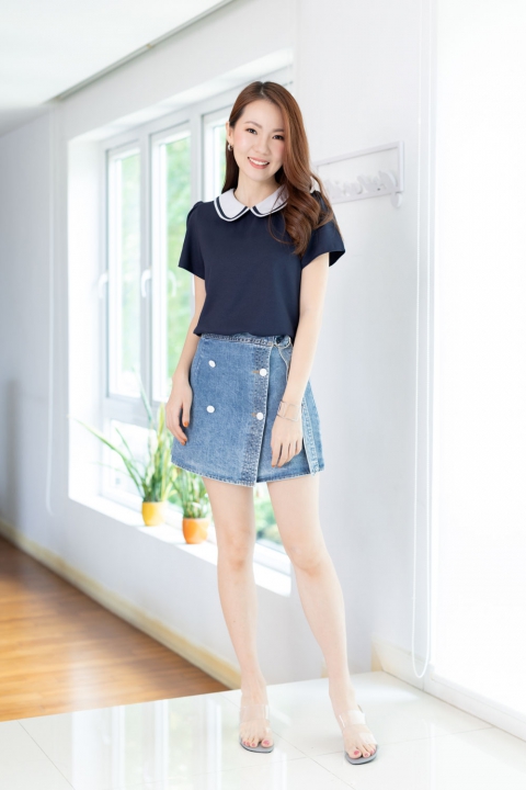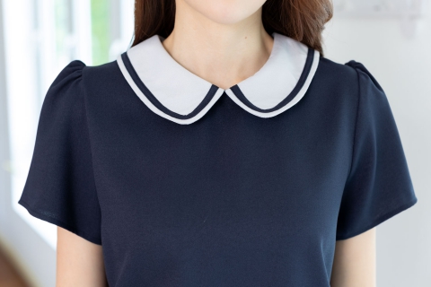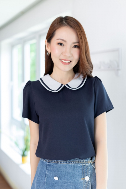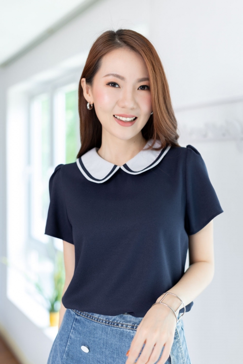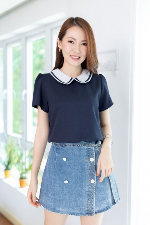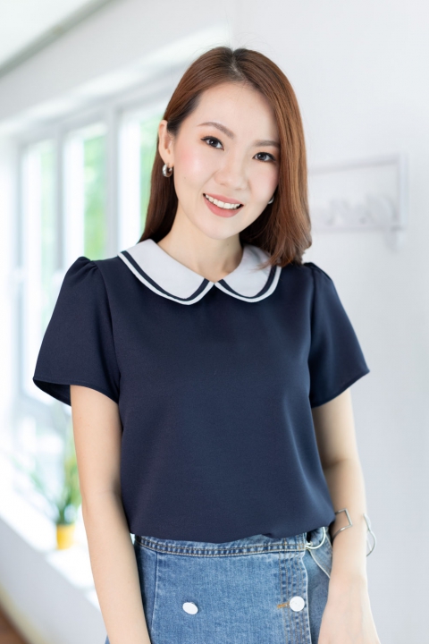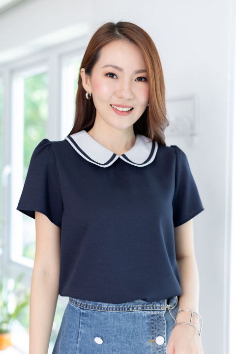 เสื้อปกบัว แต่งขอบปกด้วยกุ๊นยาว น่ารักแบบโดดเด้ง แขนสั้น ทรงใส่ง่ายเหมือนเดิม ผ่าหยดน้ำติดกระดุมคอด้านหลัง สวยด้วย แมทช์ก็ง่าย ใส่ได้ยาวๆ