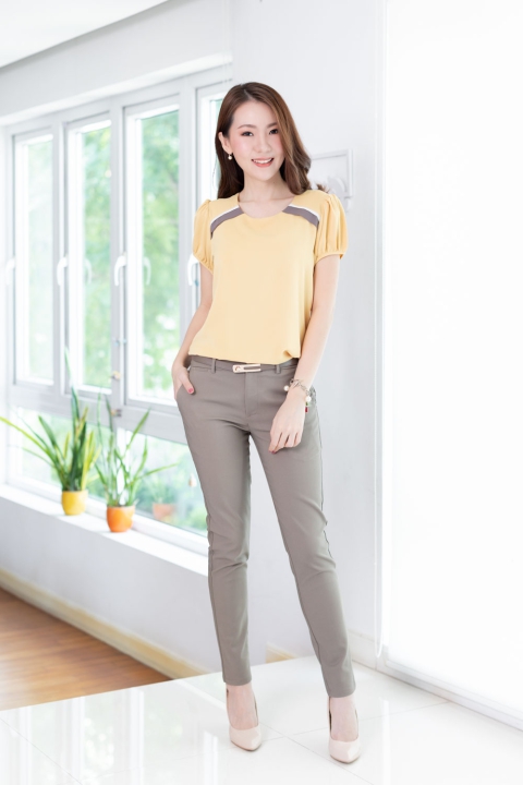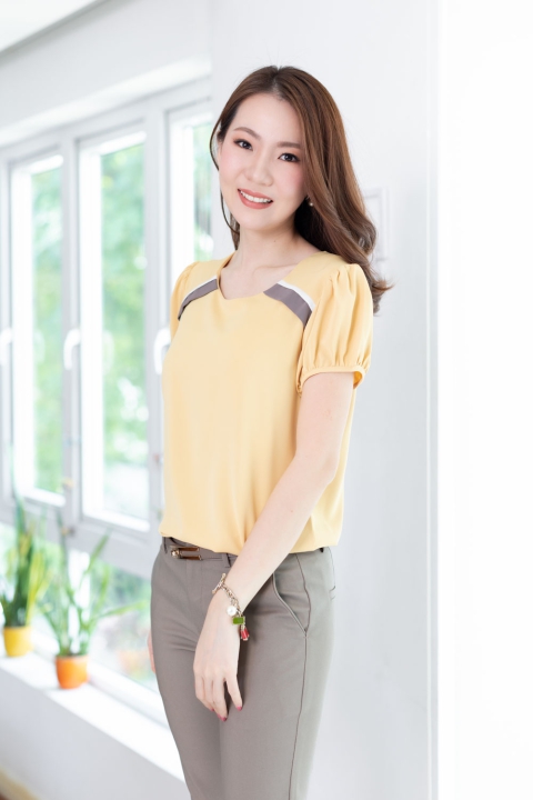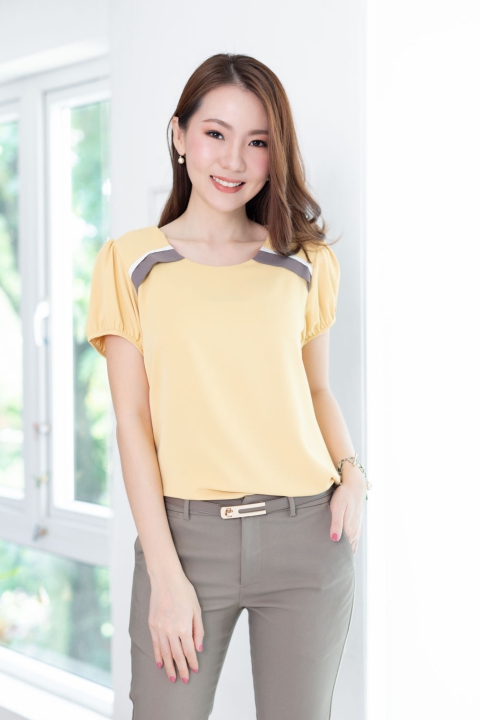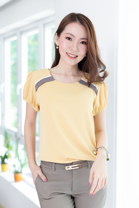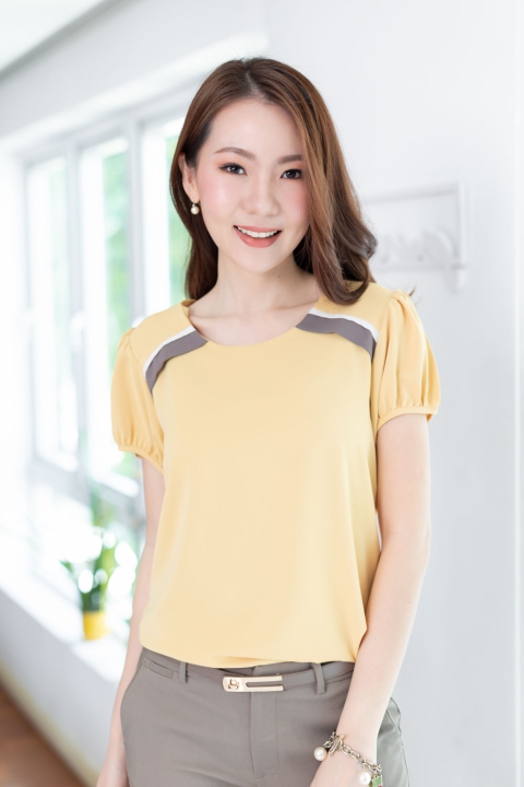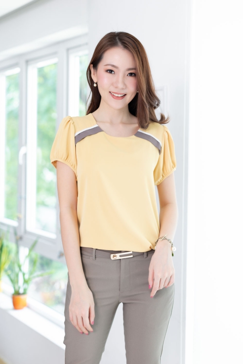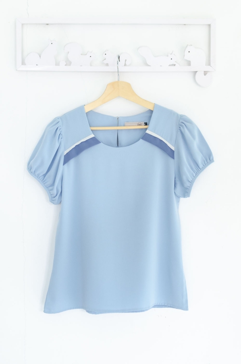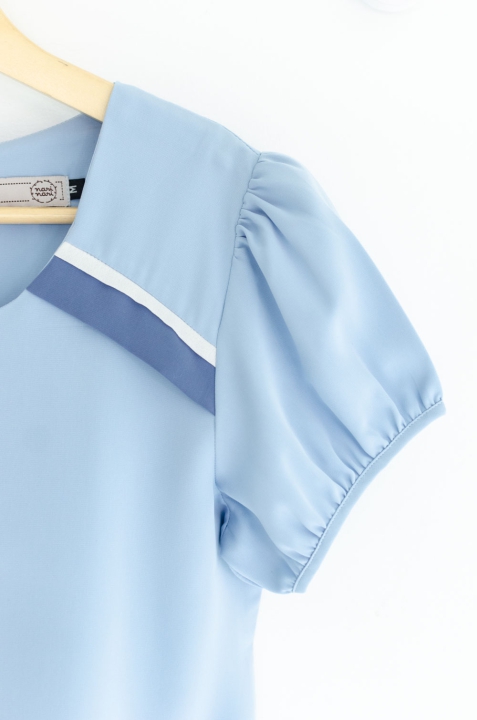 เสื้อสีพื้น แบบเรียบง่าย คอกลมแต่งแถบคู่สีตัดกัน ทรงแขนตุ๊กตาสั้นๆน่ารัก ด้านหลังผ่าหยดน้ำติดกระดุม ผ้าโพลีเอสเตอร์ผสมเนื้อเนียนลื่น ทิ้งตัว สวยหวานเรียบร้อย