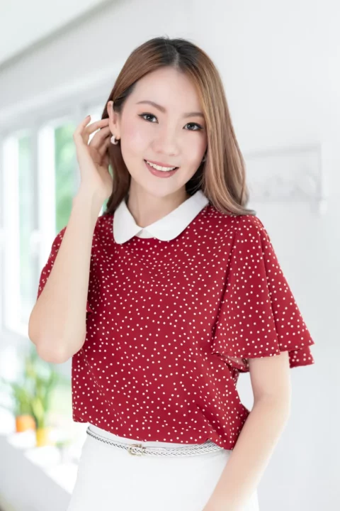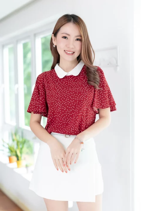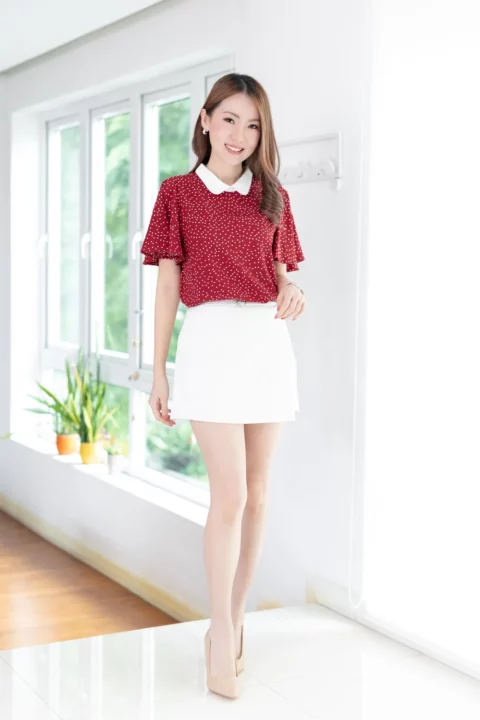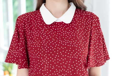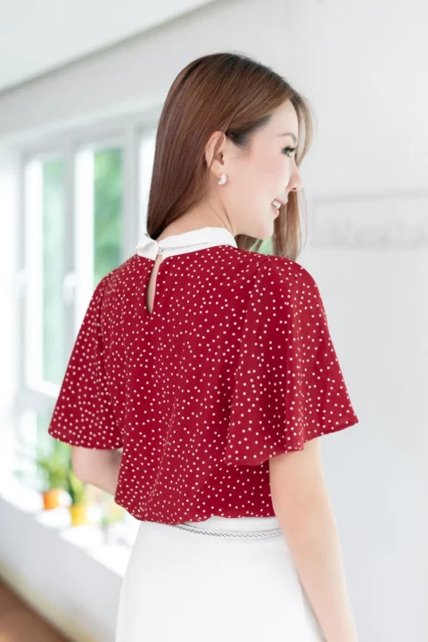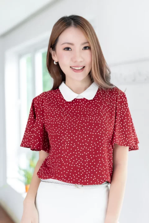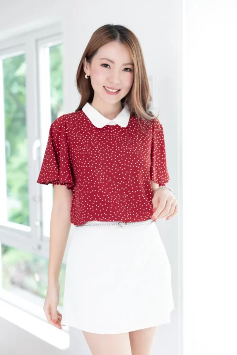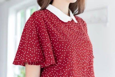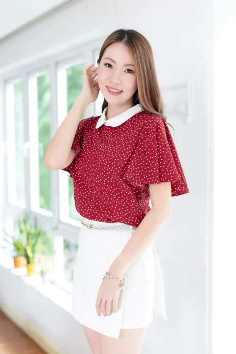 ขอมาแบบแขนผีเสื้อ นารินาริจัดให้ เสื้อคอปกบัวเล็กน่าเอ็นดู ทรงตั้งปิดคอเรียบร้อย ตัวปกเป็นสีพื้นผ่าหยดน้ำหลัง ส่วนของเสื้อใช้ผ้าลายจุด แขนเสื้อทิ้งตัวพลิ้วสวยงามยาวคลุมต้นแขน ก็จะดูเก๋ๆแอบเท่ห์ ตัวเสื้อทำทรงคอดใต้อก 1 นิ้ว รุ่นนี้จะพอดีตัวขึ้นนิดนึงค่ะ