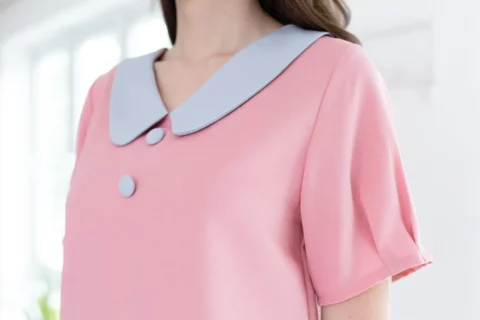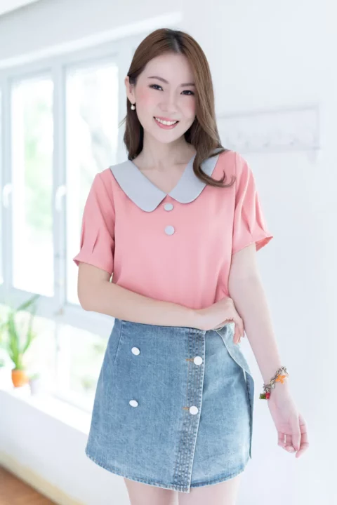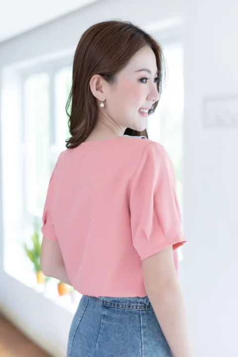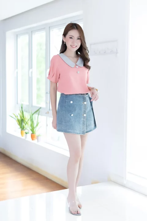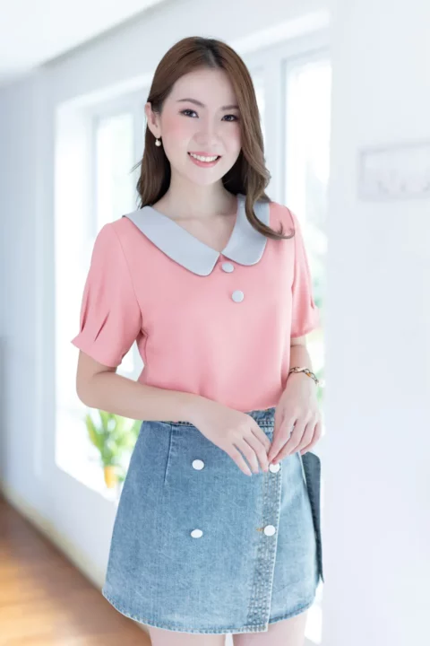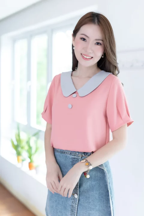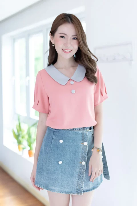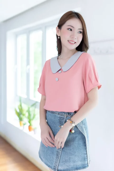 ขอแนะนำเสื้อสวยสบาย คอวีแต่งปกบัวทรงโค้งดูน่ารัก แต่งกระดุมหลอกคู่หน้า เสื้อเป็นแบบสวม แขนสั้นจับพลีทปลายแขน ใช้ผ้าโฟร์เวย์ใยฟูๆทอออกมาแล้วจะมีลายเม็ดทราย ผ้าไม่หนา ยับยากแห้งไว ดูแลง่าย
