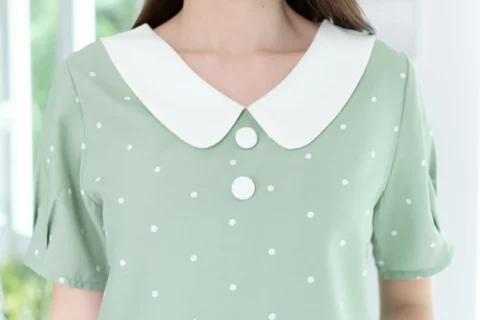 ขอแนะนำเสื้อสวยสบาย คอวีแต่งปกบัวทรงโค้งดูน่ารัก แต่งกระดุมหลอกคู่หน้า เสื้อเป็นแบบสวม แขนสั้นจับพลีทปลายแขน ใช้ผ้าไหมอิตาลีทอเรียบ เนื้อจะเนียนใส่สบายผิว