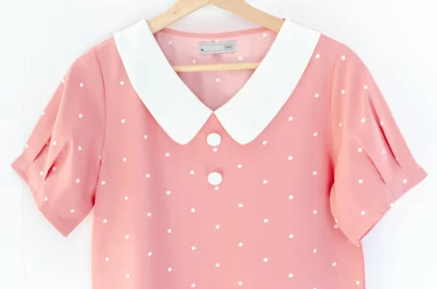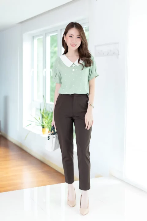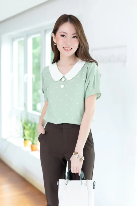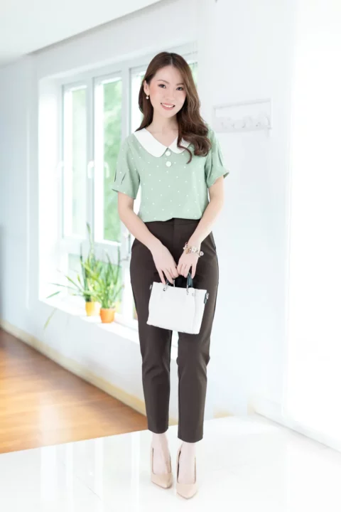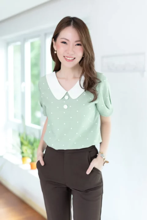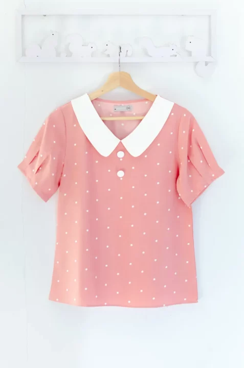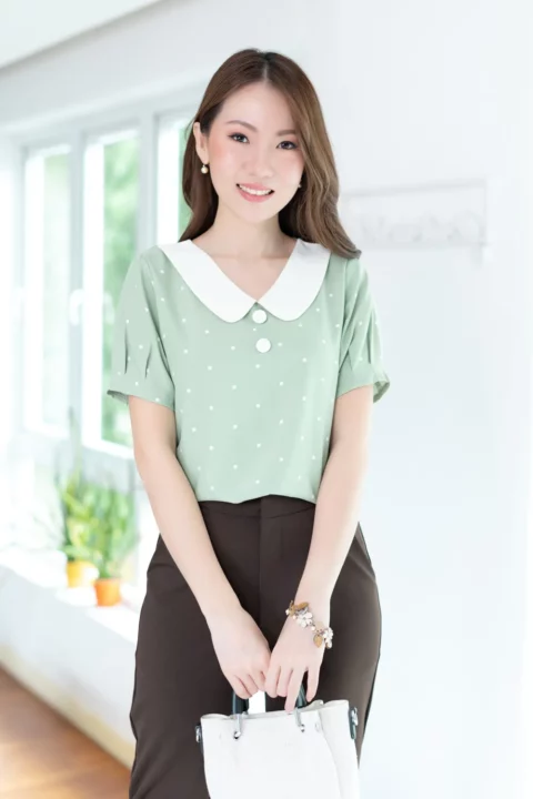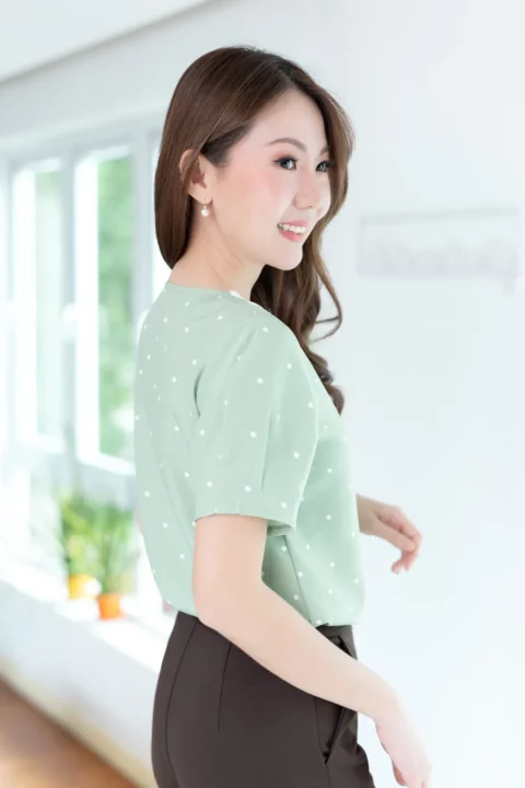 ขอแนะนำเสื้อสวยสบายแบบใหม่ คอวี ปกบัวแบบแบนทรงโค้งดูน่ารัก แต่งกระดุมหลอกคู่ เสื้อเป็นแบบสวม แขนสั้นจับพลีทปลายแขน ใช้ผ้าไหมอิตาลีทอเรียบ ลายจุดเล็กๆ เนื้อจะเนียนใส่สบายผิว *รุ่นนี้คอดใต้อก