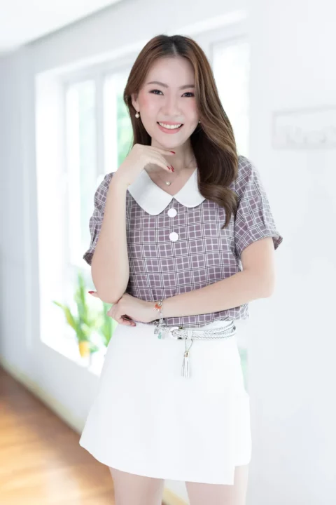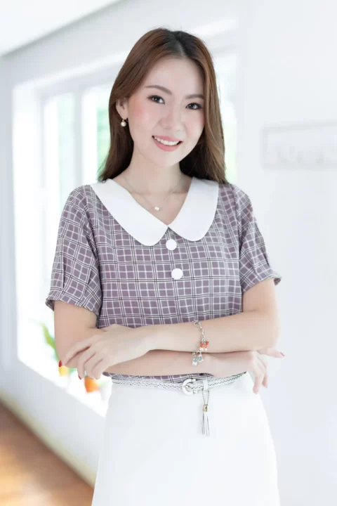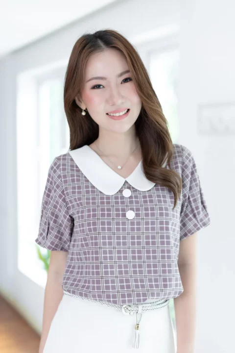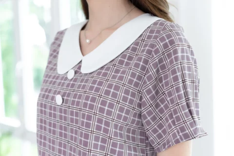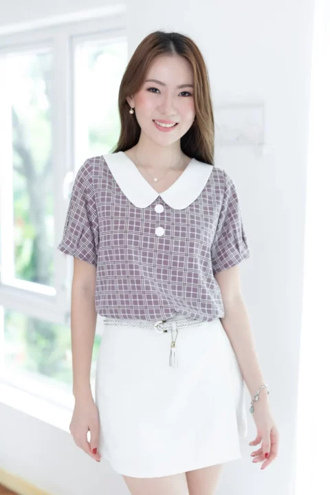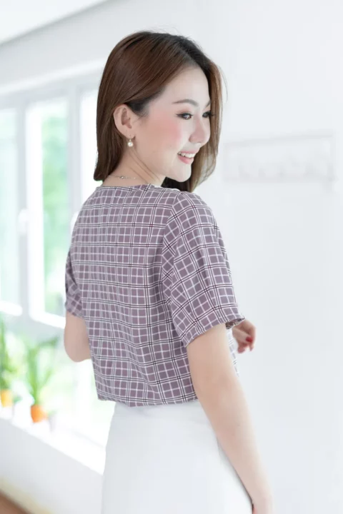 ขอแนะนำเสื้อสวยสบาย คอวีแต่งปกบัวทรงโค้งดูน่ารัก แต่งกระดุมหลอกคู่หน้า เสื้อเป็นแบบสวม แขนสั้นจับพลีทปลายแขน ใช้ผ้าไหมอิตาลีทอเรียบ เนื้อจะเนียนใส่สบายผิว พิมพ์ลายตาราง
