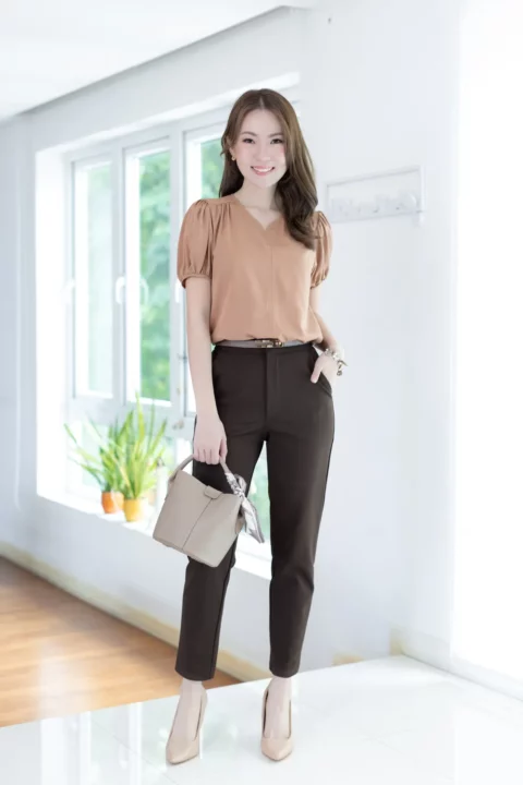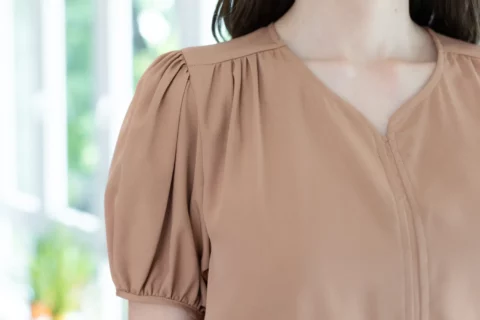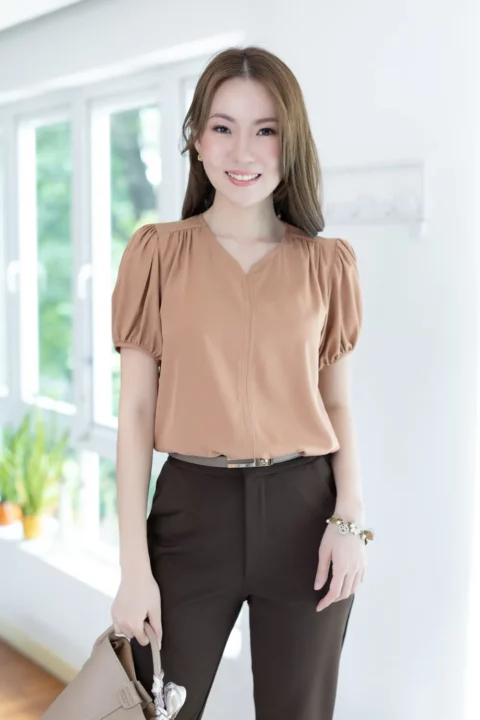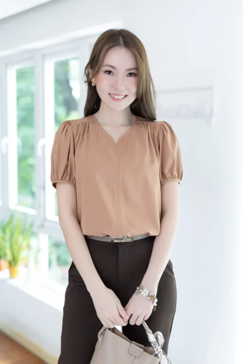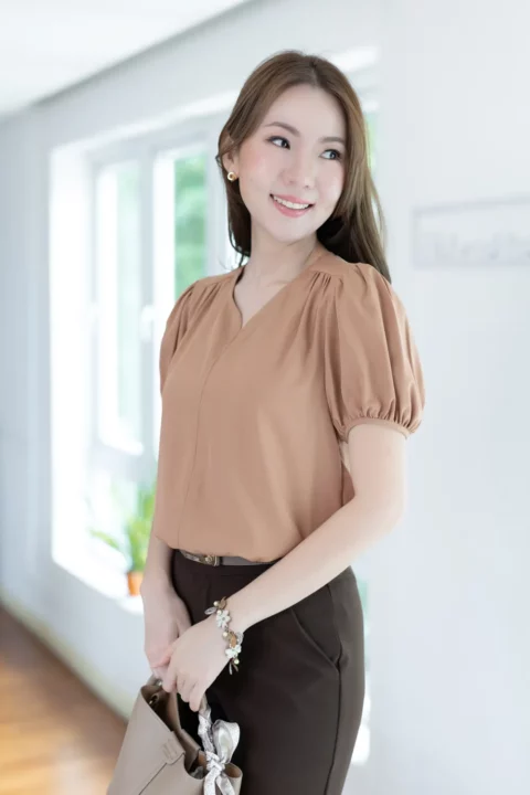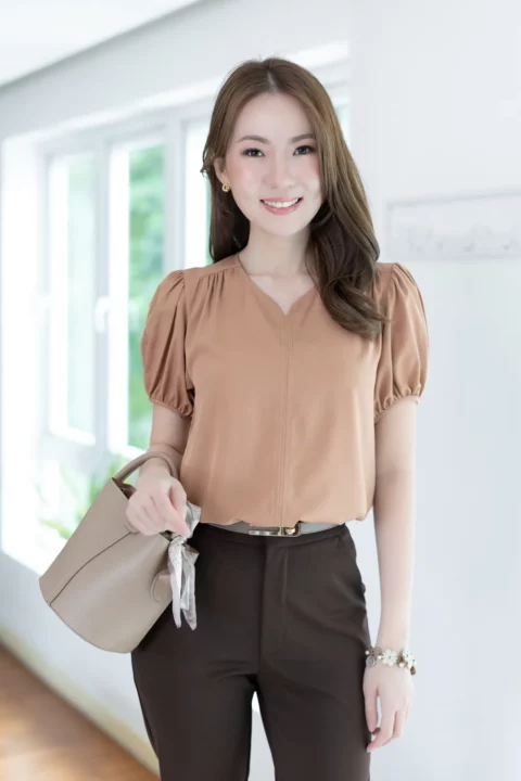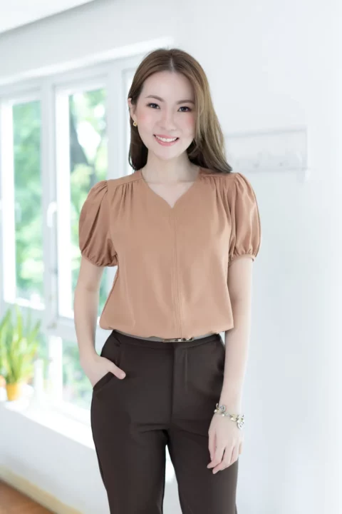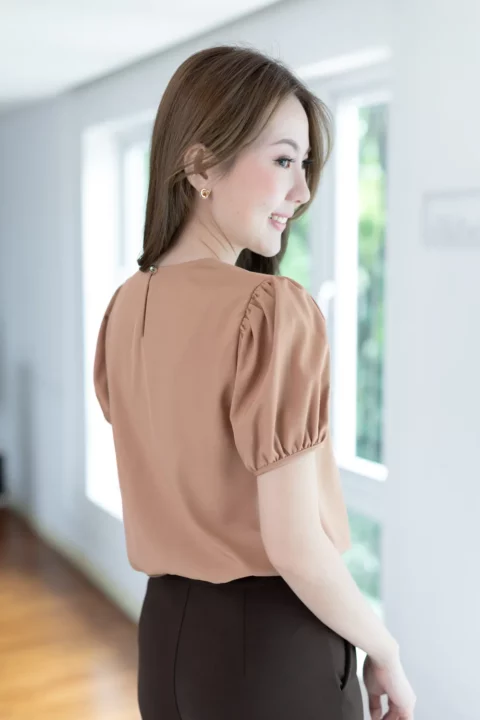 MT4527 Notch Neck Puff Sleeve Blouse – Brown