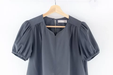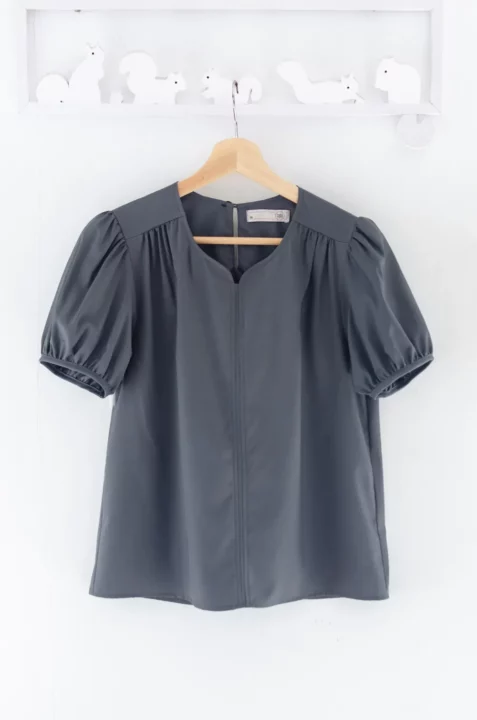เสื้อสีเรียบๆแต่แอบเก๋ คอกลมแต่งบากตรงกลางแบบปาดโค้งต่อเป็นคัตติ้งยาวด้านหน้า ช่วงไหล่แต่งจีบรูด แขนตุ๊กตาสั้น ใช้ผ้าไหมอิตาลีสีพื้น เนื้อผ้าสัมผัสดีเรียบเนียน ทรงใส่ได้นานๆเลย