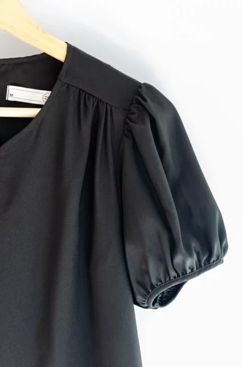 เสื้อสีพื้นแบบเรียบๆแต่แอบเก๋ คอกลมแต่งบากตรงกลางแบบปาดโค้งต่อเป็นคัตติ้งยาวด้านหน้า ช่วงไหล่แต่งจีบรูด แขนตุ๊กตาสั้น ใช้ผ้าไหมอิตาลีสีพื้น เนื้อผ้าสัมผัสดีเรียบเนียน ทรงใส่ได้นานๆเลย