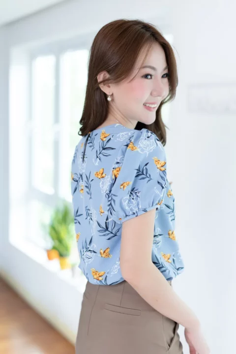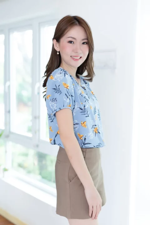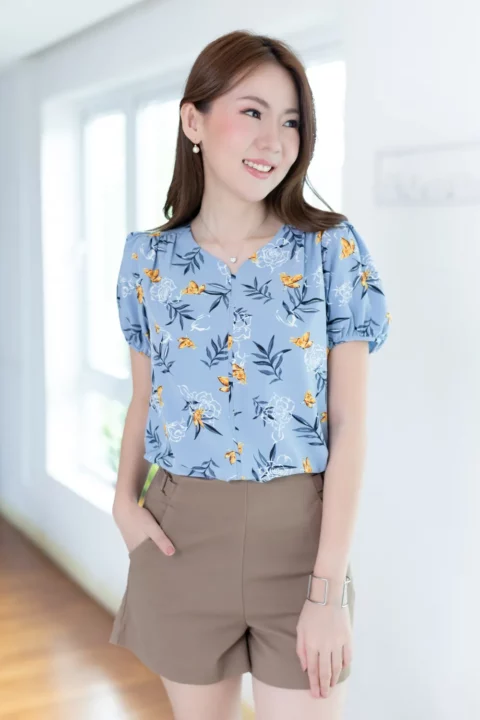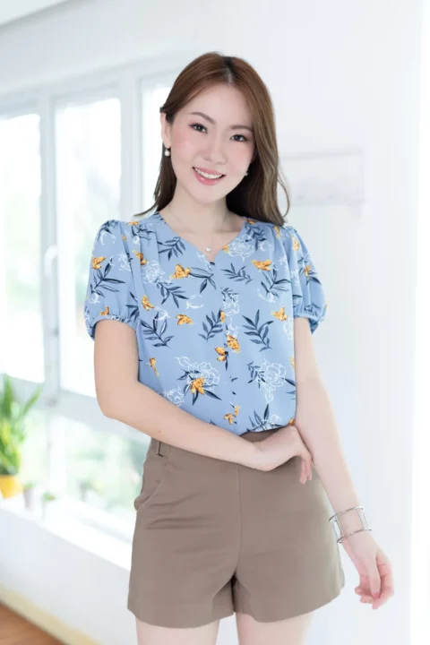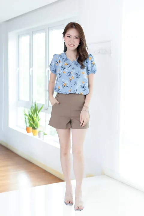 เสื้อสีพื้นแบบเรียบๆแต่แอบเก๋ คอกลมแต่งบากตรงกลางแบบปาดโค้งต่อเป็นคัตติ้งยาวด้านหน้า ช่วงไหล่แต่งจีบรูด แขนตุ๊กตาสั้น ใช้ผ้าโฟร์เวย์สีพื้น ผ้าดี ดูแลง่าย แห้งไว ทรงใส่ได้นานๆเลย