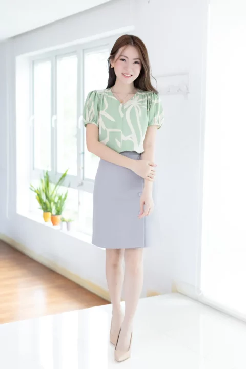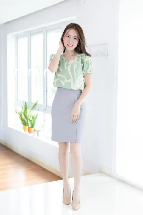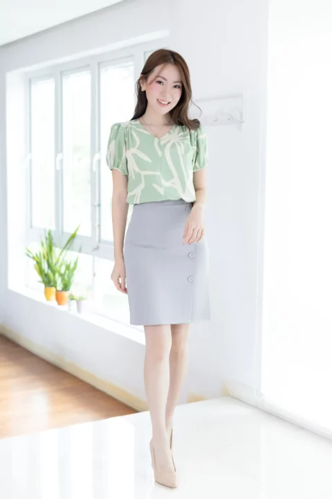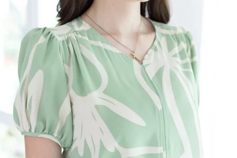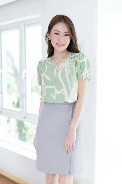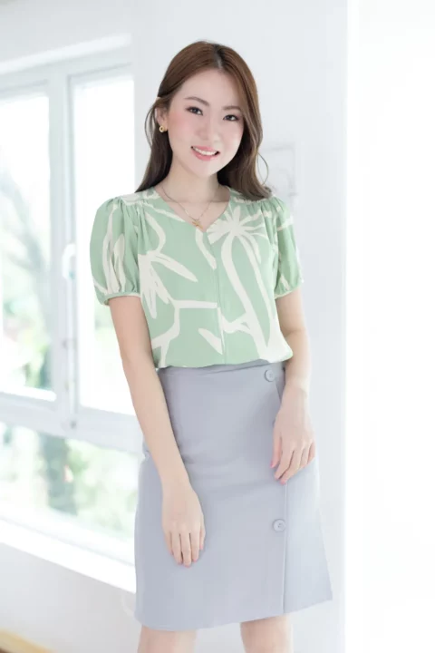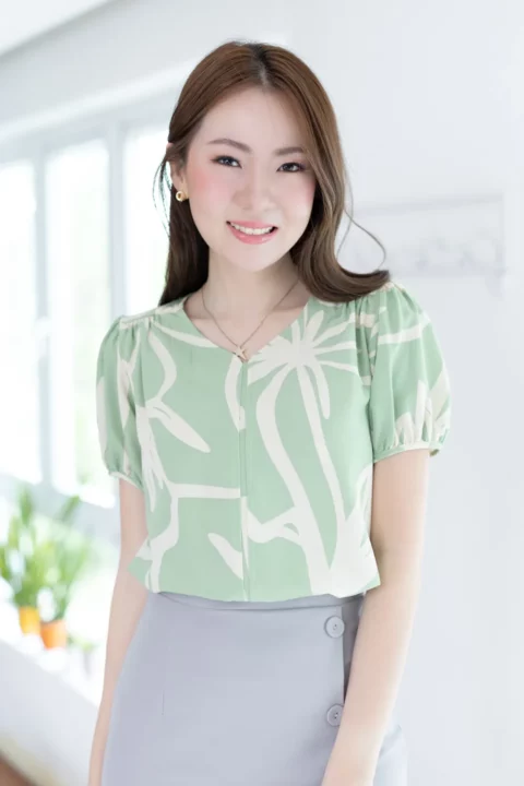 MT4527 Graphic Notch Neck Puff Sleeve Blouse – Green