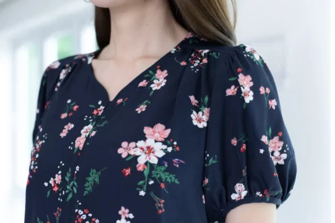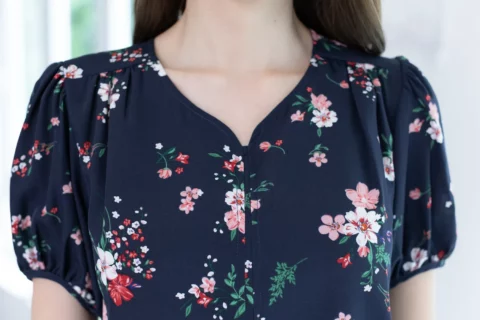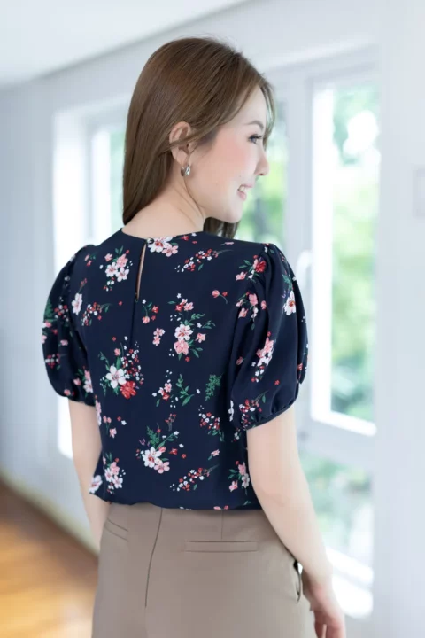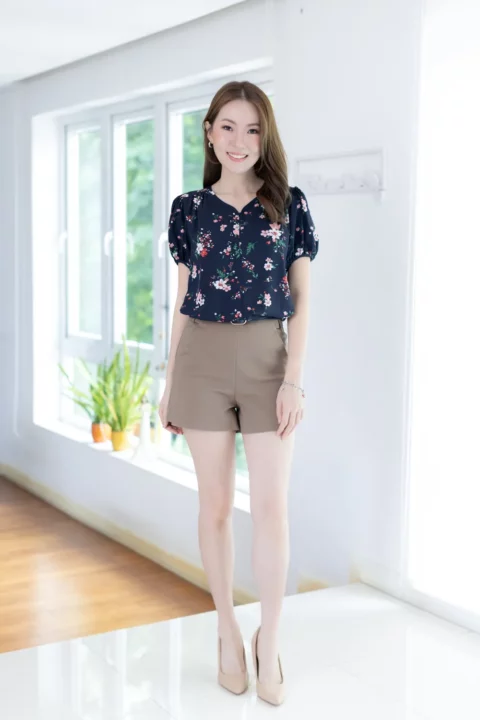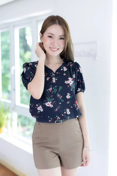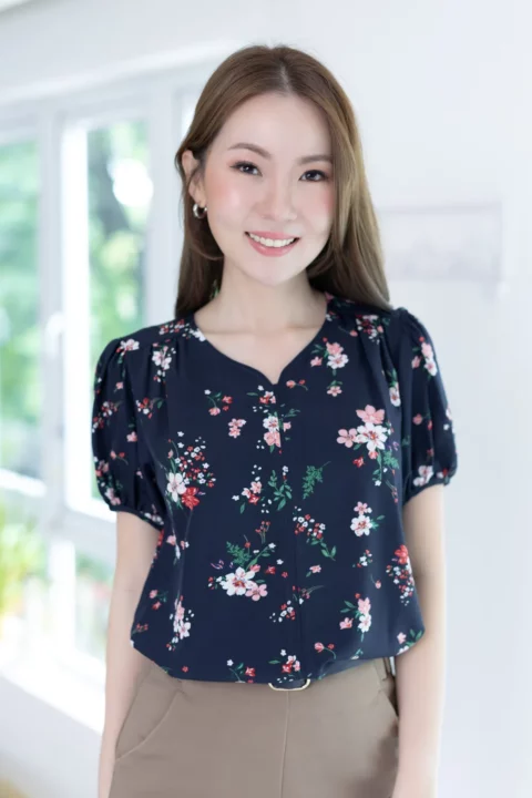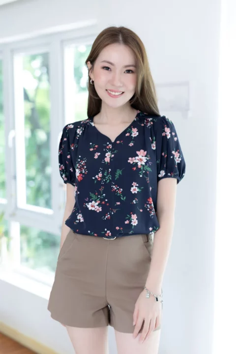 เสื้อคัตติ้งเก๋ คอกลมแต่งบากตรงกลางแบบปาดโค้งต่อเป็นคัตติ้งยาวด้านหน้า ช่วงไหล่แต่งจีบรูด แขนตุ๊กตาสั้น ใช้ผ้าไหมอิตาลี เนื้อผ้าสัมผัสดีเรียบเนียน ทรงใส่ได้นานๆเลย ผ้าพิมพ์ลายดอกไม้ มู้ดสบายๆ