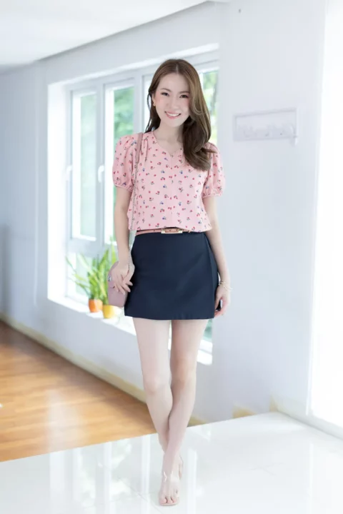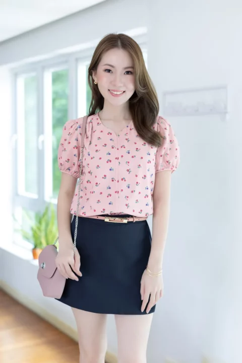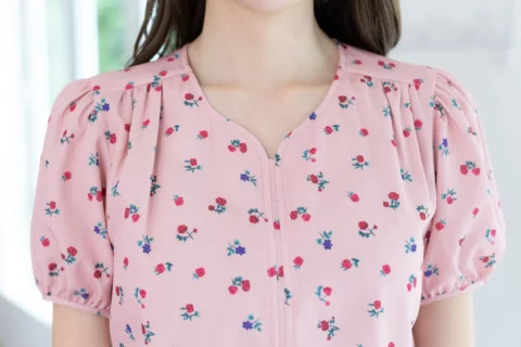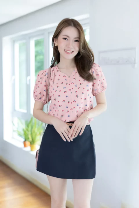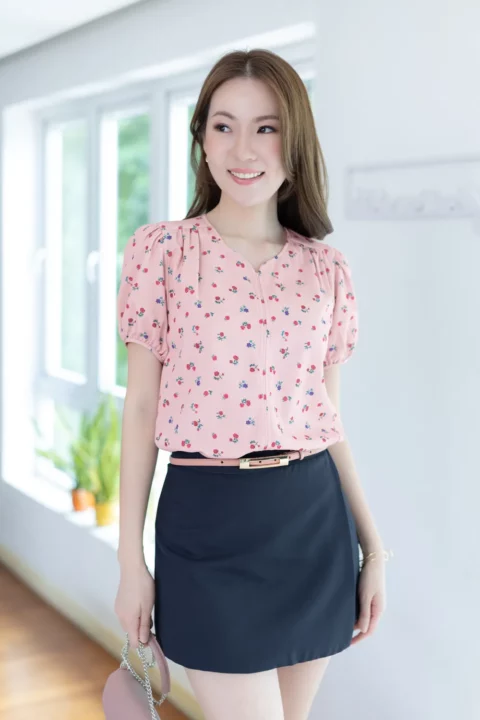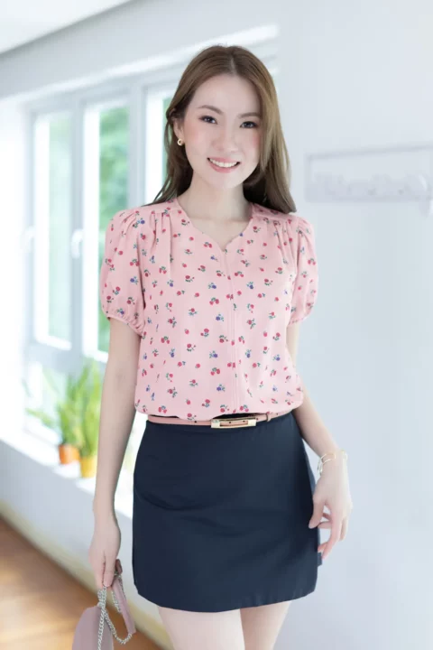 เสื้อคัตติ้งเก๋ คอกลมแต่งบากตรงกลางแบบปาดโค้งต่อเป็นคัตติ้งยาวด้านหน้า ช่วงไหล่แต่งจีบรูด แขนตุ๊กตาสั้น ใช้ผ้าโพลีเอสเตอร์อัดย่น ทรงใส่ได้นานๆเลย ผ้าพิมพ์ลายดอกไม้เล็กๆ สวยหวาน