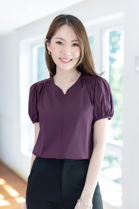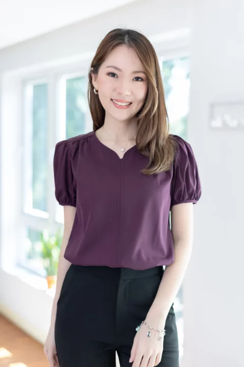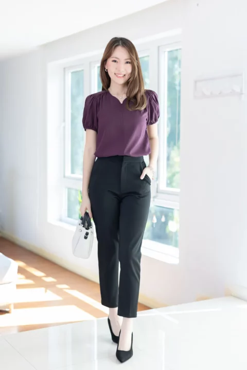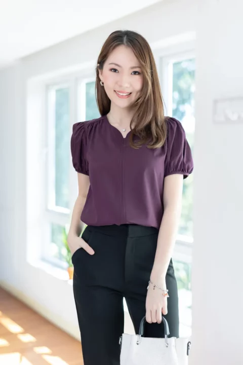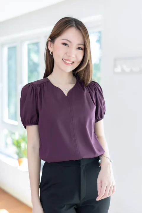 เสื้อสีพื้นแบบเรียบๆแต่แอบเก๋ คอกลมแต่งบากตรงกลางแบบปาดโค้งต่อเป็นคัตติ้งยาวด้านหน้า ช่วงไหล่แต่งจีบรูด แขนตุ๊กตาสั้น ใช้ผ้าไหมอิตาลีสีพื้น เนื้อผ้าสัมผัสดีเรียบเนียน ทรงใส่ได้นานๆเลย