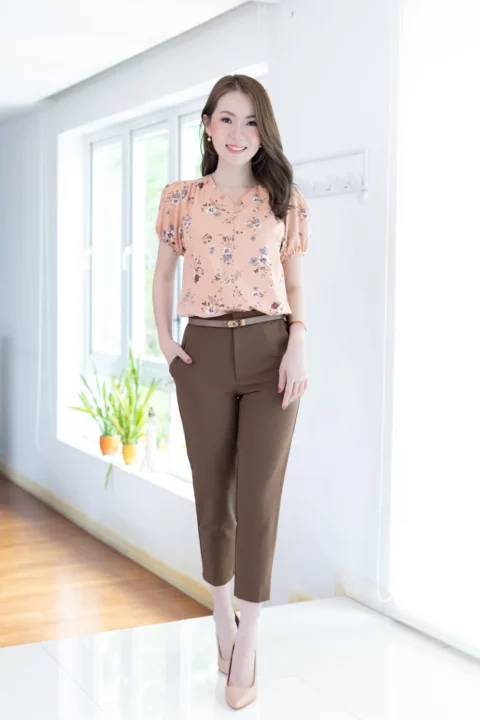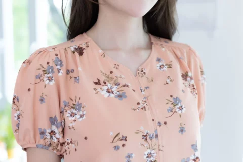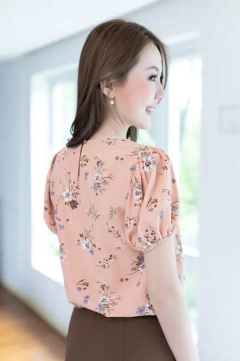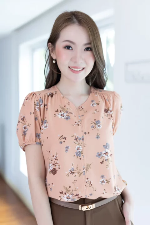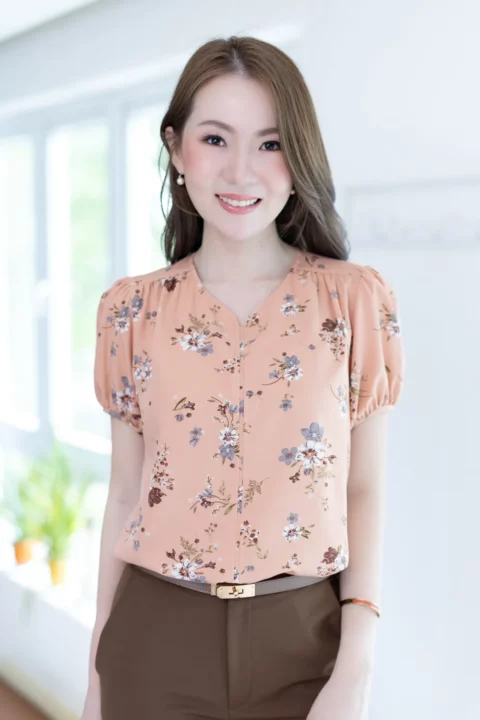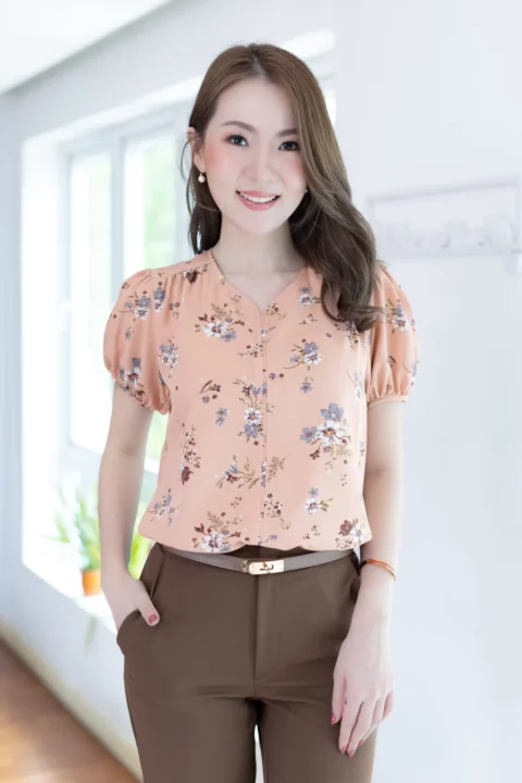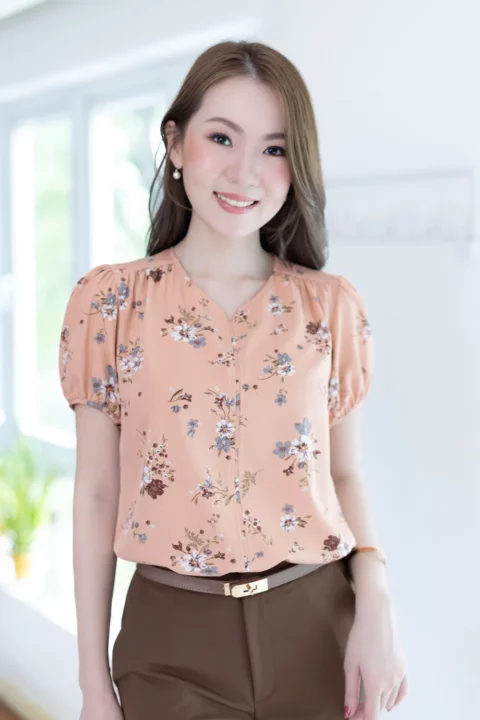 เสื้อคัตติ้งเก๋ คอกลมแต่งบากตรงกลางแบบปาดโค้งต่อเป็นคัตติ้งยาวด้านหน้า ช่วงไหล่แต่งจีบรูด แขนตุ๊กตาสั้น ใช้ผ้าไหมอิตาลี เนื้อผ้าสัมผัสดีเรียบเนียน ทรงใส่ได้นานๆเลย ผ้าพิมพ์ลายดอกไม้ มู้ดสบายๆ