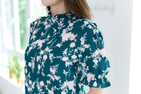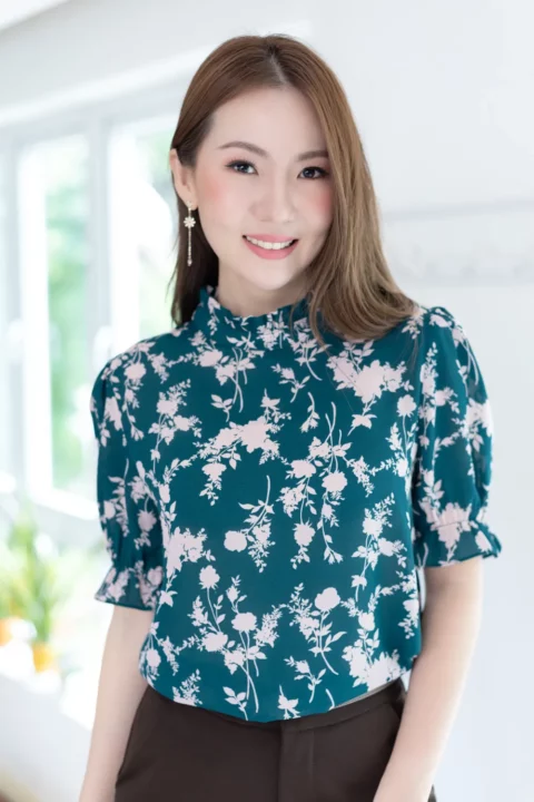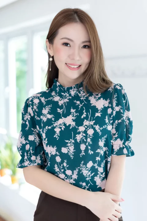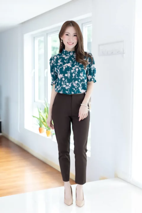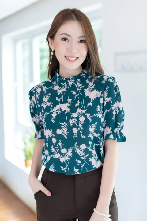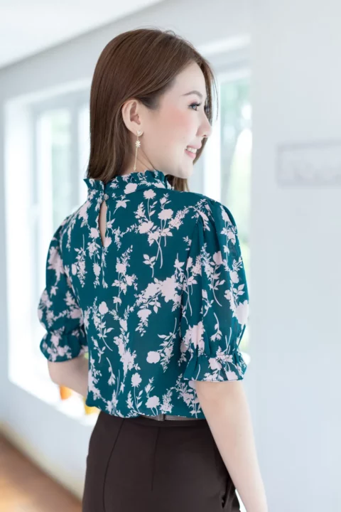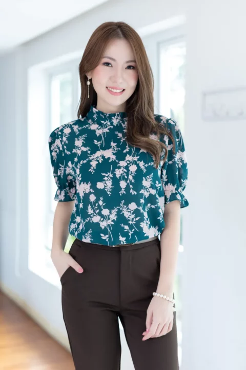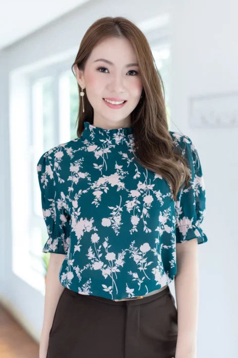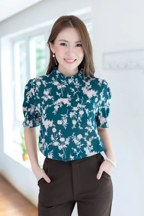 เสื้อคอปิดแต่งจีบรูดแน่นๆรอบขอบคอเสื้อ เสริมกรอบหน้าให้ดูโดดเด่น ทรงสุภาพเรียบร้อย ต่อแขนสั้นจั๊มยางยืดดูพองนิดๆ เนื้อผ้าชีฟองซูเปอร์ลายดอกไม้ สวยหวาน ผ้าทิ้งตัวสวยงาม