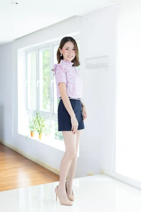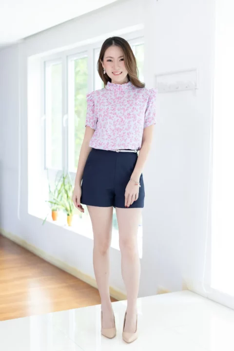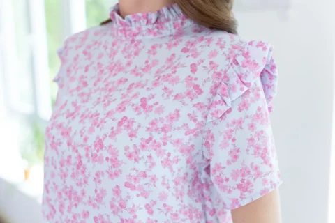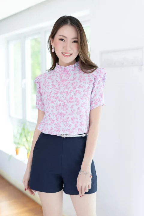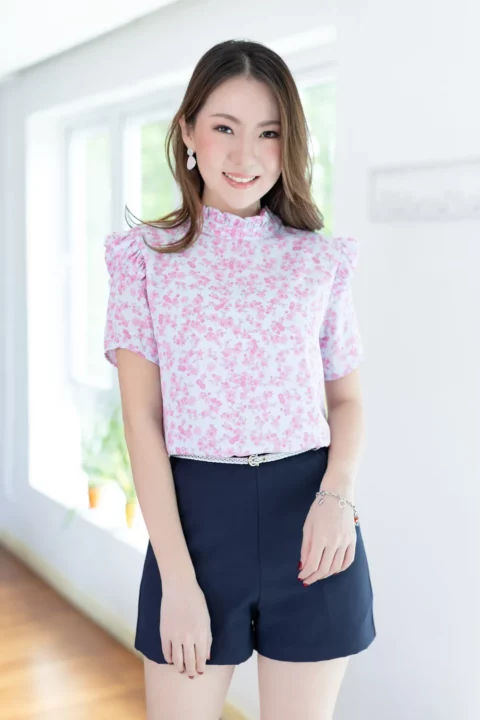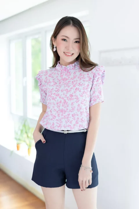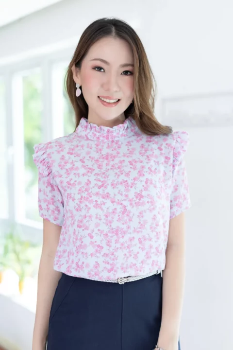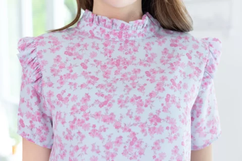 เสื้อคอปิดต่อแขนทรงกระบอกสั้น แต่งจีบรูดแน่นๆรอบขอบคอเสื้อและหัวไหล่ เสริมกรอบหน้าให้ดูโดดเด่น ทรงสุภาพเรียบร้อย ด้านหลังผ่าสั้น สวมใส่สะดวกไม่ติดศรีษะ ใช้ผ้าชีฟองซูเปอร์ลายดอกไม้สวยหวาน ผ้าทิ้งตัวสวยงาม