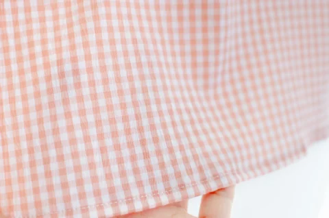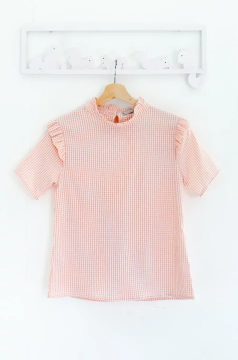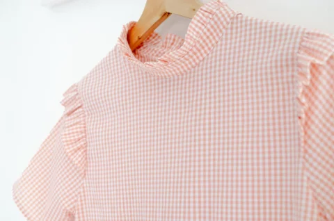 เสื้อคอปิดต่อแขนทรงกระบอกสั้น แต่งจีบรูดแน่นๆรอบขอบคอเสื้อและหัวไหล่ เสริมกรอบหน้าให้ดูโดดเด่น ทรงสุภาพเรียบร้อย ด้านหลังผ่าสั้น สวมใส่สะดวกไม่ติดศรีษะ ใช้ผ้าโพลีเอสเตอร์อัดย่น เนื้อยืดหยุ่น ลายตารางเล็กสวยหวาน