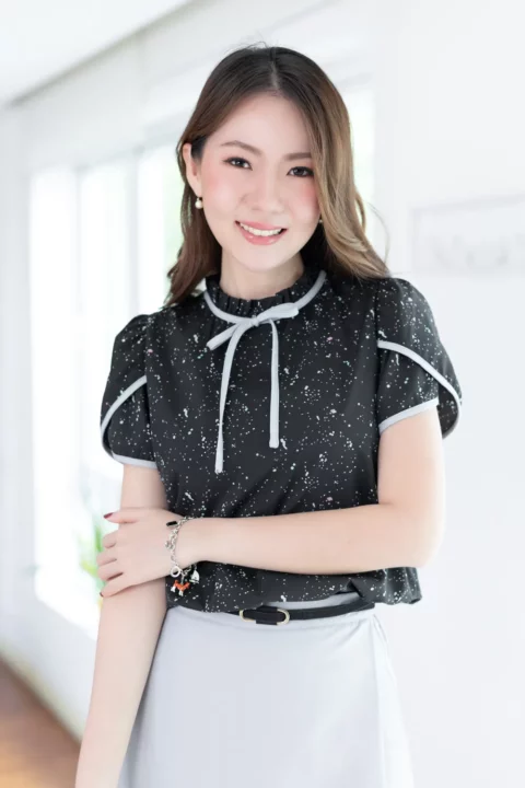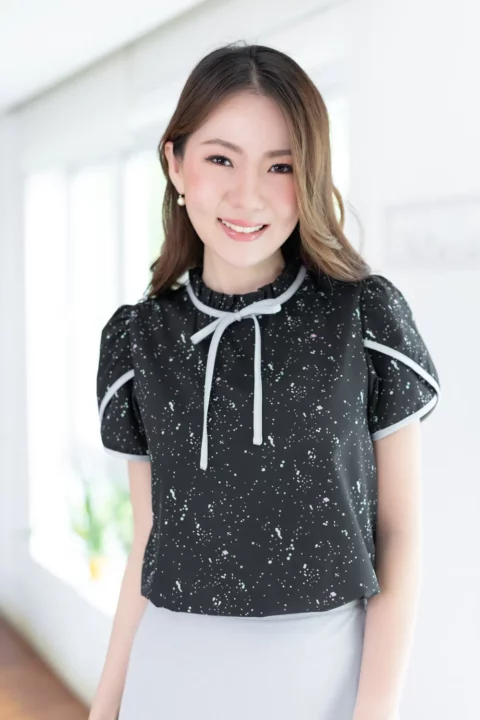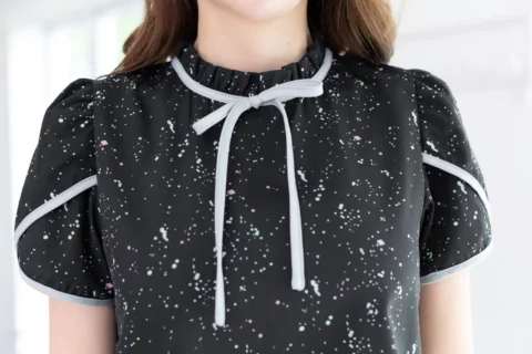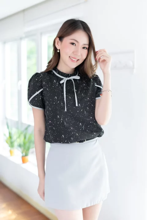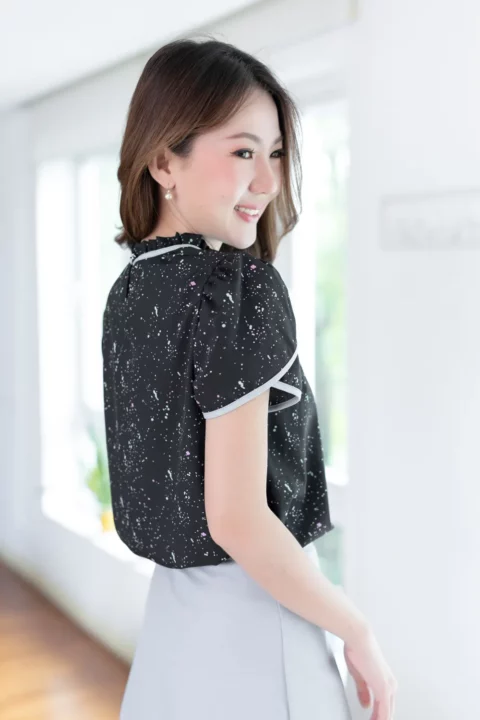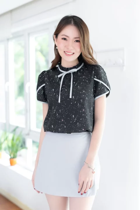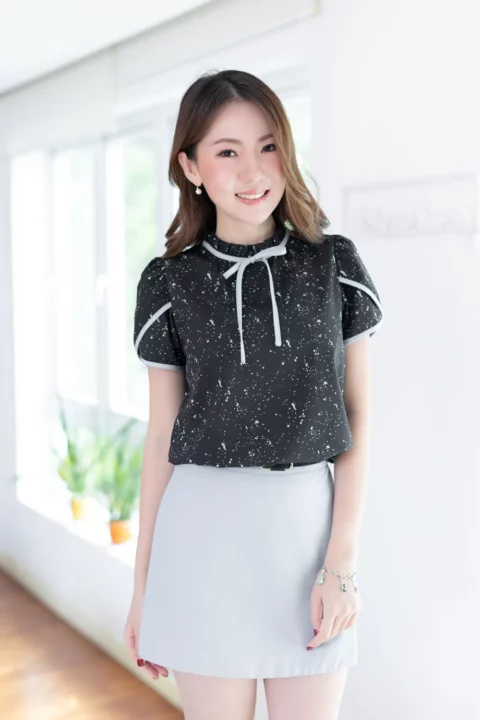 ช่วงนี้อยากเพิ่มเติมความโรแมนติกให้กับการแต่งตัว งานจีบคอคืออันดับ 1 เลย จีบแบบไม่สูงมาก คอปิดแต่งสายโบว์ยาว แขนสั้นซ้อนทรงกลีบดอกไม้ รวบรวมดีเทลเฟมินินเข้าไว้ด้วยกัน ใช้ผ้าพิมพ์ลายกราฟิกดูสนุกขึ้น สวยหวานไม่น่าเบื่อ