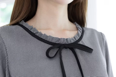 เสื้อคอกลม แต่งจีบสั้นๆและกุ๊นรอบคอพร้อมสายโบว์ยาวด้านหน้า แขนยาวจังหวะสวยก่อนถึงข้อมือ ตัดเย็บด้วยเนื้อผ้าไหมอิตาลีเนื้อเนียน พิมพ์ลายกราฟิก รุ่นนี้เป็นแบบสวมนะคะ