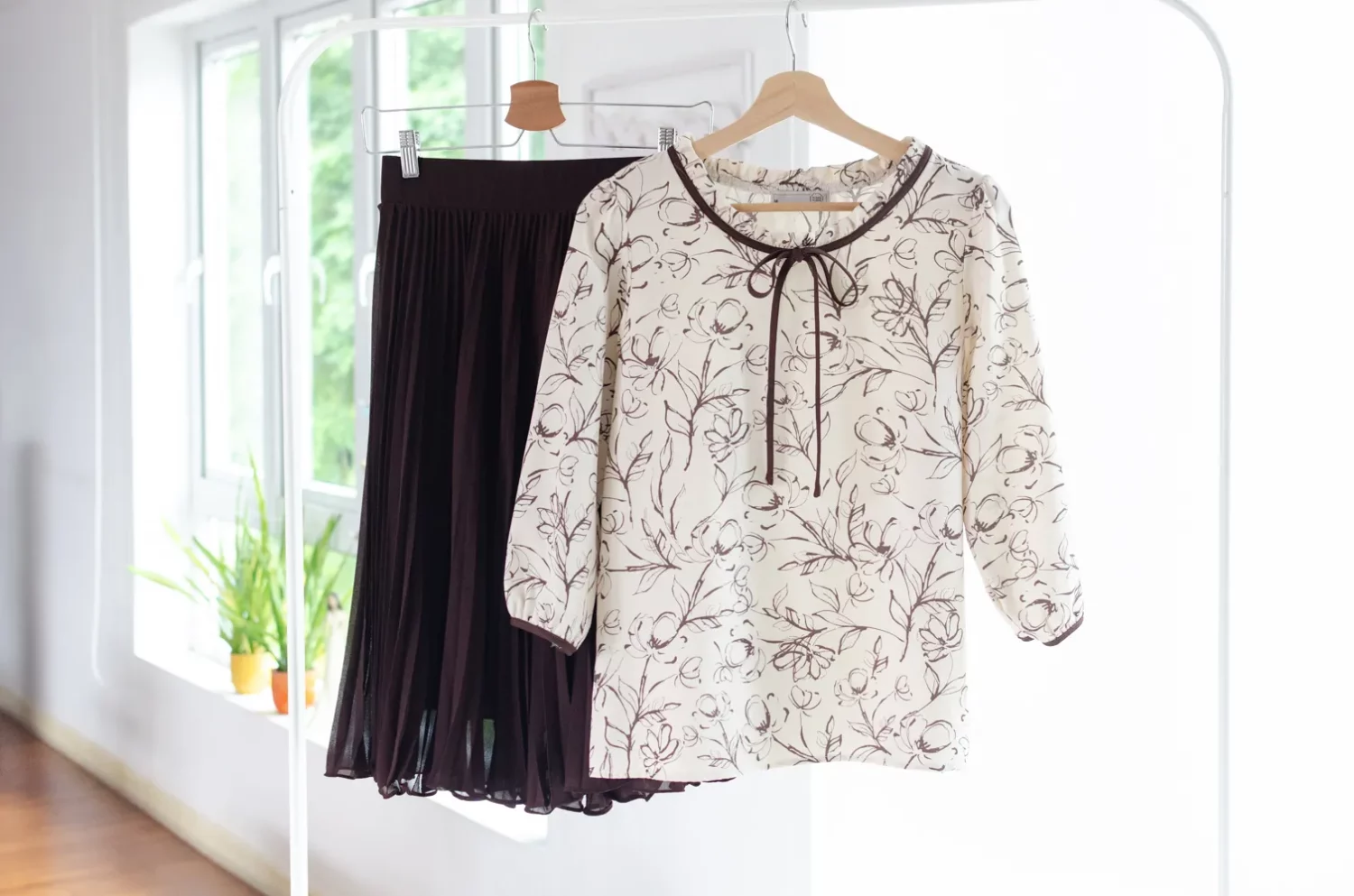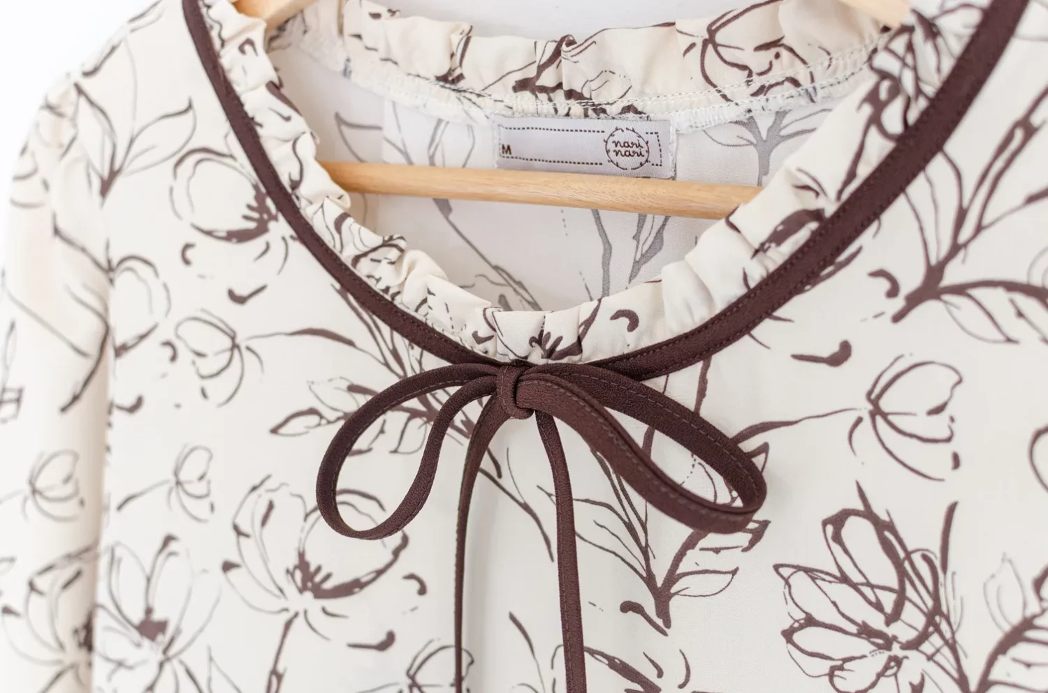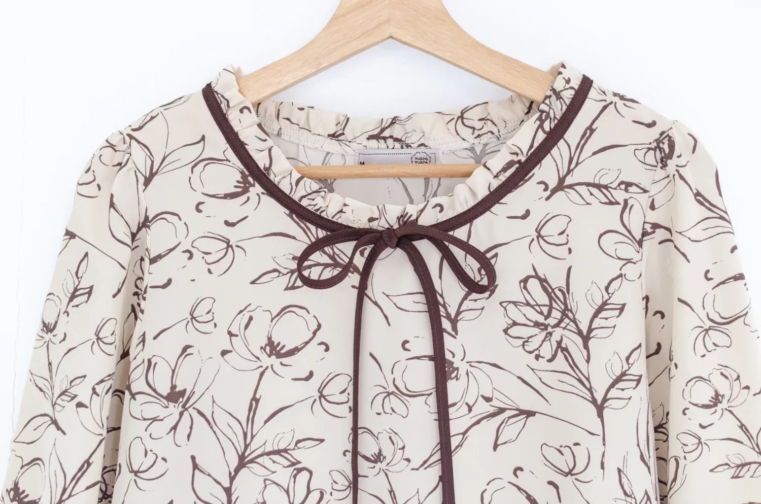 เสื้อคอกลม แต่งจีบสั้นๆและกุ๊นรอบคอพร้อมสายโบว์ยาวด้านหน้า แขนยาวจังหวะสวยก่อนถึงข้อมือ ตัดเย็บด้วยเนื้อผ้าไหมอิตาลีเนื้อเนียน พิมพ์ลายดอกไม้ รุ่นนี้เป็นแบบสวมนะคะ