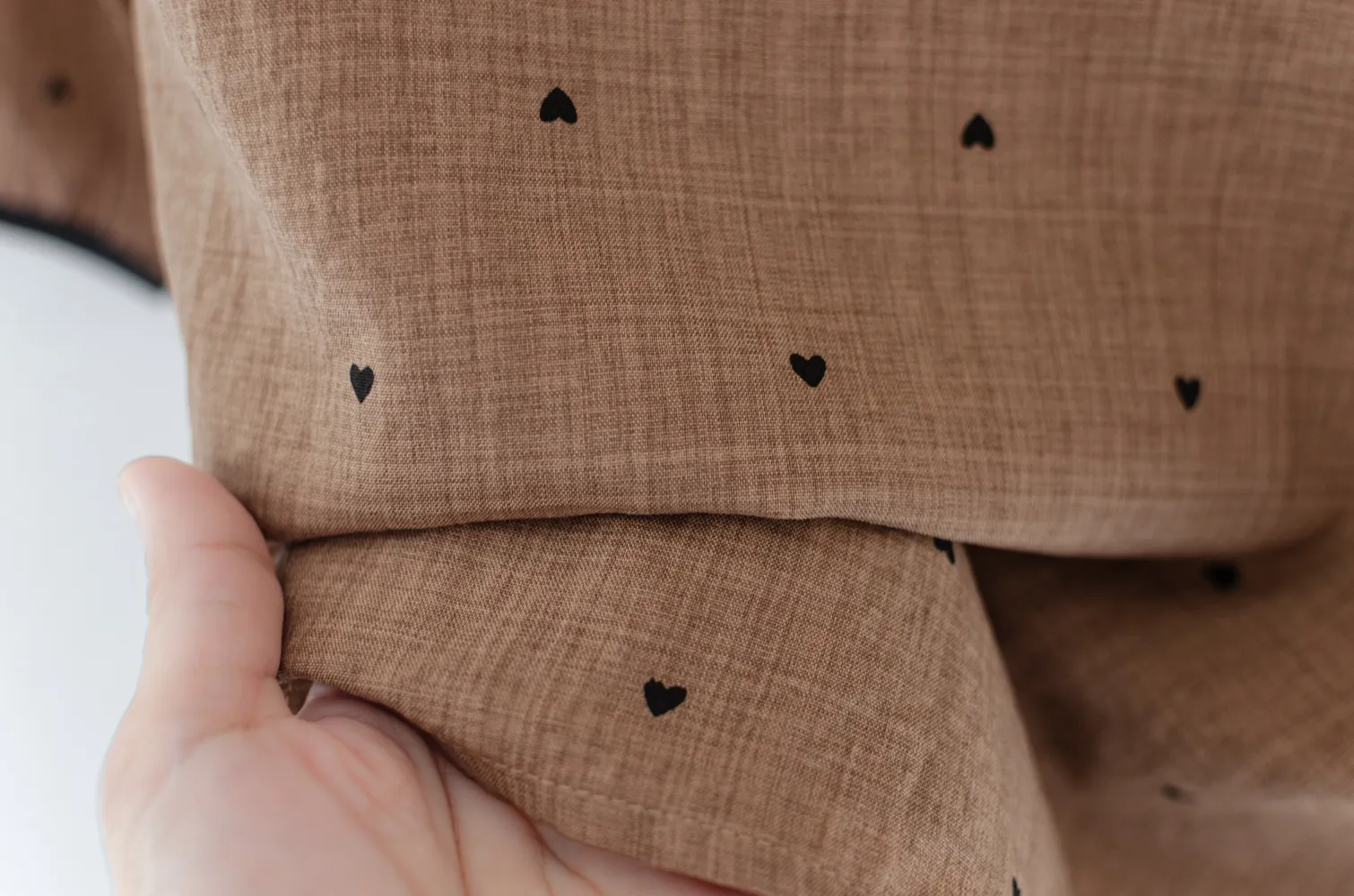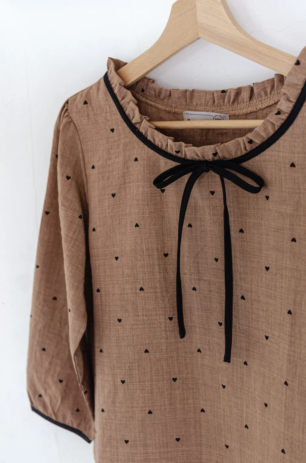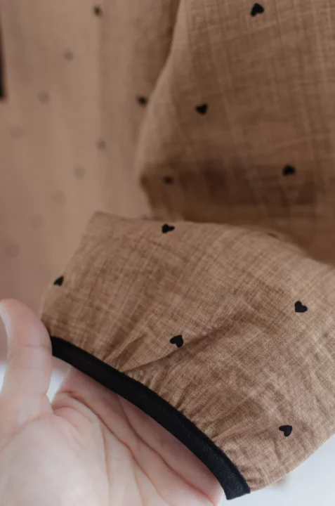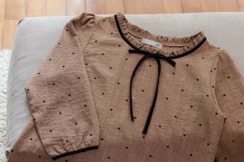 เสื้อคอกลม แต่งจีบสั้นๆและกุ๊นรอบคอพร้อมสายโบว์ยาวด้านหน้า แขนยาวจังหวะสวยก่อนถึงข้อมือ รุ่นนี้เป็นแบบสวมนะคะ เนื้อผ้าโซดาทอมีลายในตัว Texture ผ้าจะให้อารมณ์แบบลินินลายสลาฟ แต่เนื้อนิ่มม ไม่บางโปร่งแสงเกินไป ใส่สบายและดูแลง่าย ดูมีลูกเล่น ไม่เรียบเกินไป