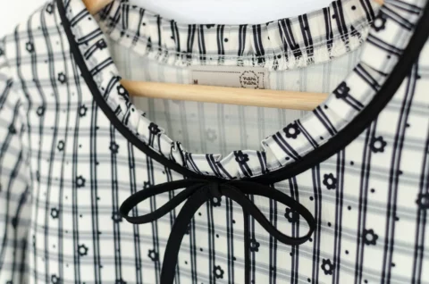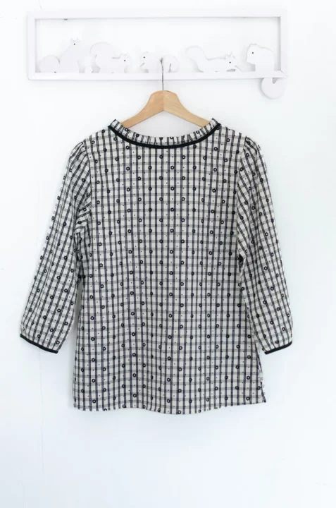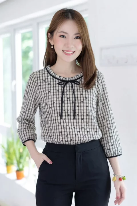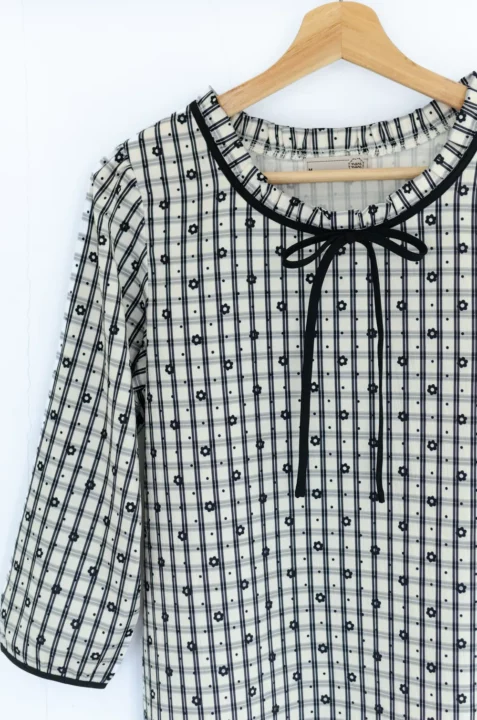 เสื้อคอกลม แต่งจีบสั้นๆและกุ๊นรอบคอพร้อมสายโบว์ยาวด้านหน้า แขนยาวจังหวะสวยก่อนถึงข้อมือ รุ่นนี้เป็นแบบสวมนะคะ ตัดเย็บด้วยผ้ามี Texture ย่นๆ พิมพ์ลายตาราง ลายจุดและดอกเดซี่ น่ารักสุดใจ 🖤