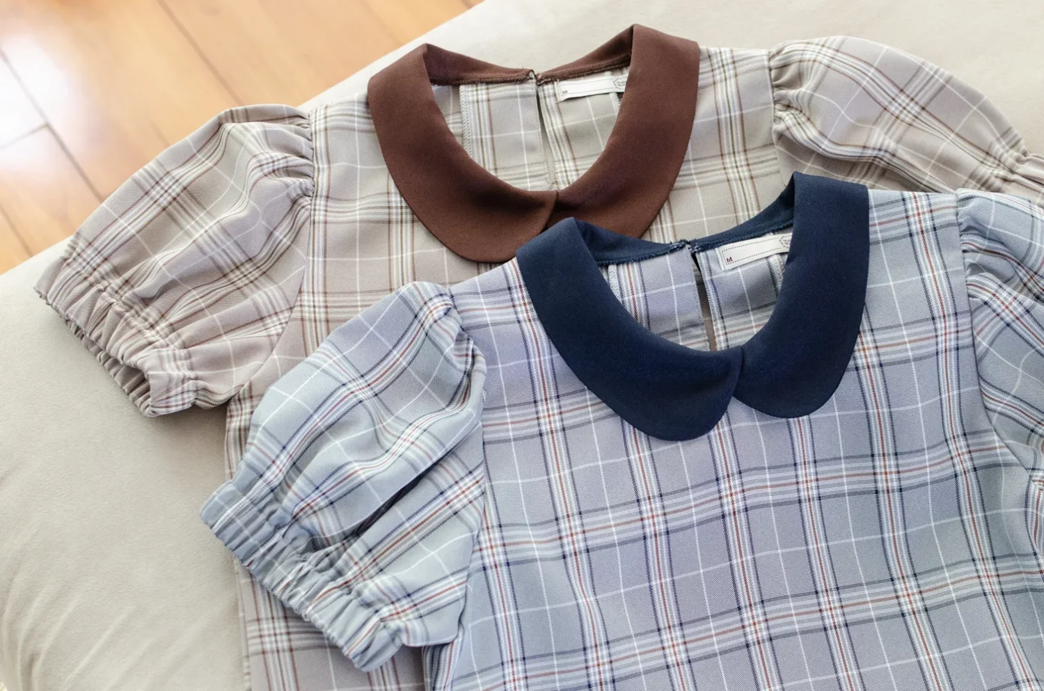 เสื้อปกบัวที่แอบเก๋ด้วยดีเทลวางซ้อนกันด้านหน้า แขนตุ๊กตาแบบสั้นแต่งจั๊มยางยืดหนาตรงปลายแขน ผ่าหยดน้ำหลังติดกระดุม ผ้าลายตารางสีนัวๆสวยมาก เนื้อผ้าดีความหนากลางๆไม่บางเกินไปแต่ไม่โปร่งโป๊ น้ำหนักดีทรงสวยงาม