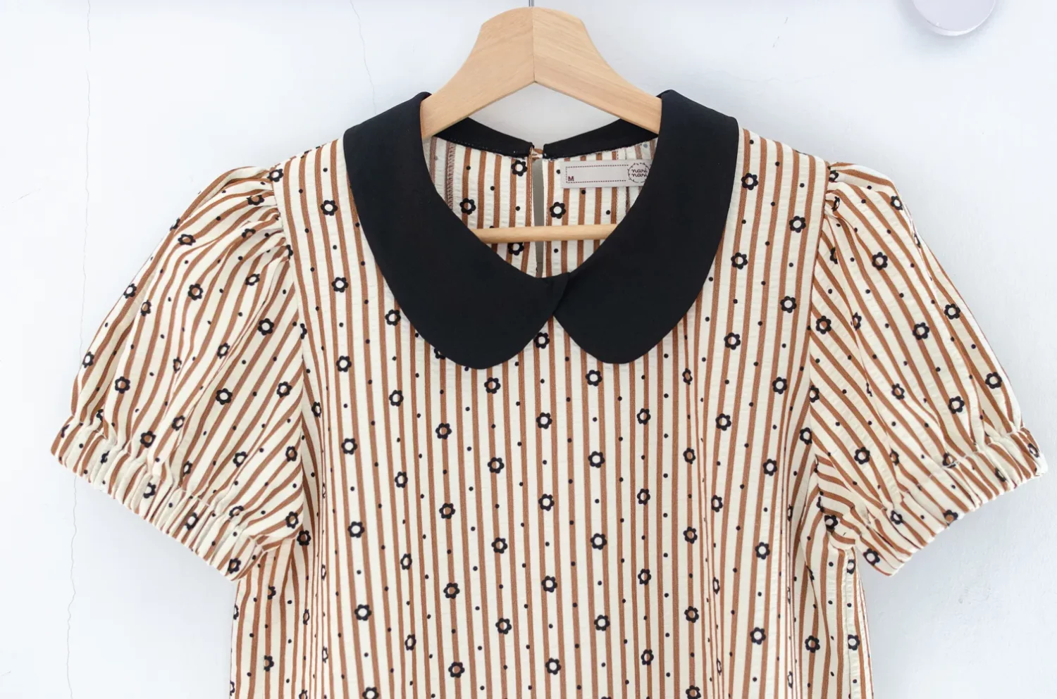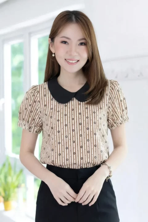 เสื้อปกบัวที่แอบเก๋ด้วยดีเทลวางซ้อนกันด้านหน้า แขนตุ๊กตาแบบสั้นแต่งจั๊มยางยืดหนาตรงปลายแขน ผ่าหยดน้ำหลังติดกระดุม ผ้าลายริ้วย่นสีนัวๆสวยมาก พิมพ์ลายดอกเดซี่ สลับลายจุด