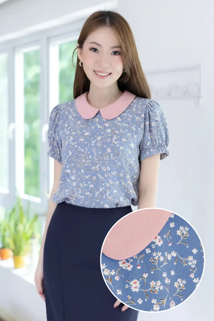 เสื้อปกบัวที่แอบเก๋ด้วยดีเทลวางซ้อนกันด้านหน้า แขนตุ๊กตาแบบสั้นแต่งจั๊มยางยืดหนาปลายแขน ตัดเย็บด้วยผ้าไหมอิตาลีลายดอกไม้ เนื้อดีเนียนเรียบ ใส่สบายผิว ผ่าหยดน้ำหลังติดกระดุม