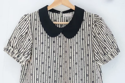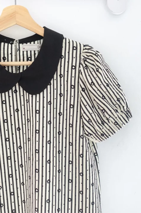 เสื้อปกบัวที่แอบเก๋ด้วยดีเทลวางซ้อนกันด้านหน้า แขนตุ๊กตาแบบสั้นแต่งจั๊มยางยืดหนาตรงปลายแขน ผ่าหยดน้ำหลังติดกระดุม ผ้าลายริ้วย่นสีนัวๆสวยมาก พิมพ์ลายดอกเดซี่ สลับลายจุด